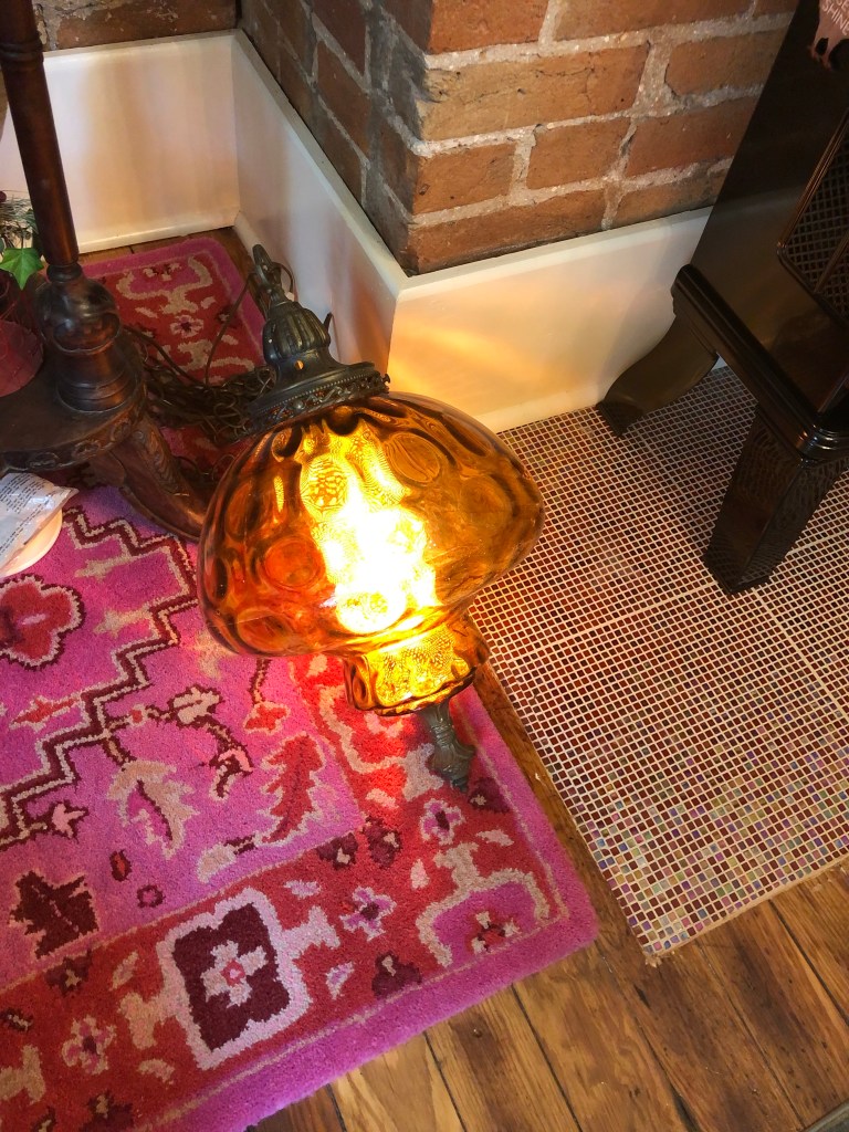For the left side, I have this beautiful hanging lamp that I bought from my friend Jean. While it’s old, it’s actually never been used, and still has the tag on it! It was made in Tyler, Texas. There was even hanging hardware with it, so all I need to do is clear the space and ask Chris to hang if up. Isn’t it cool?