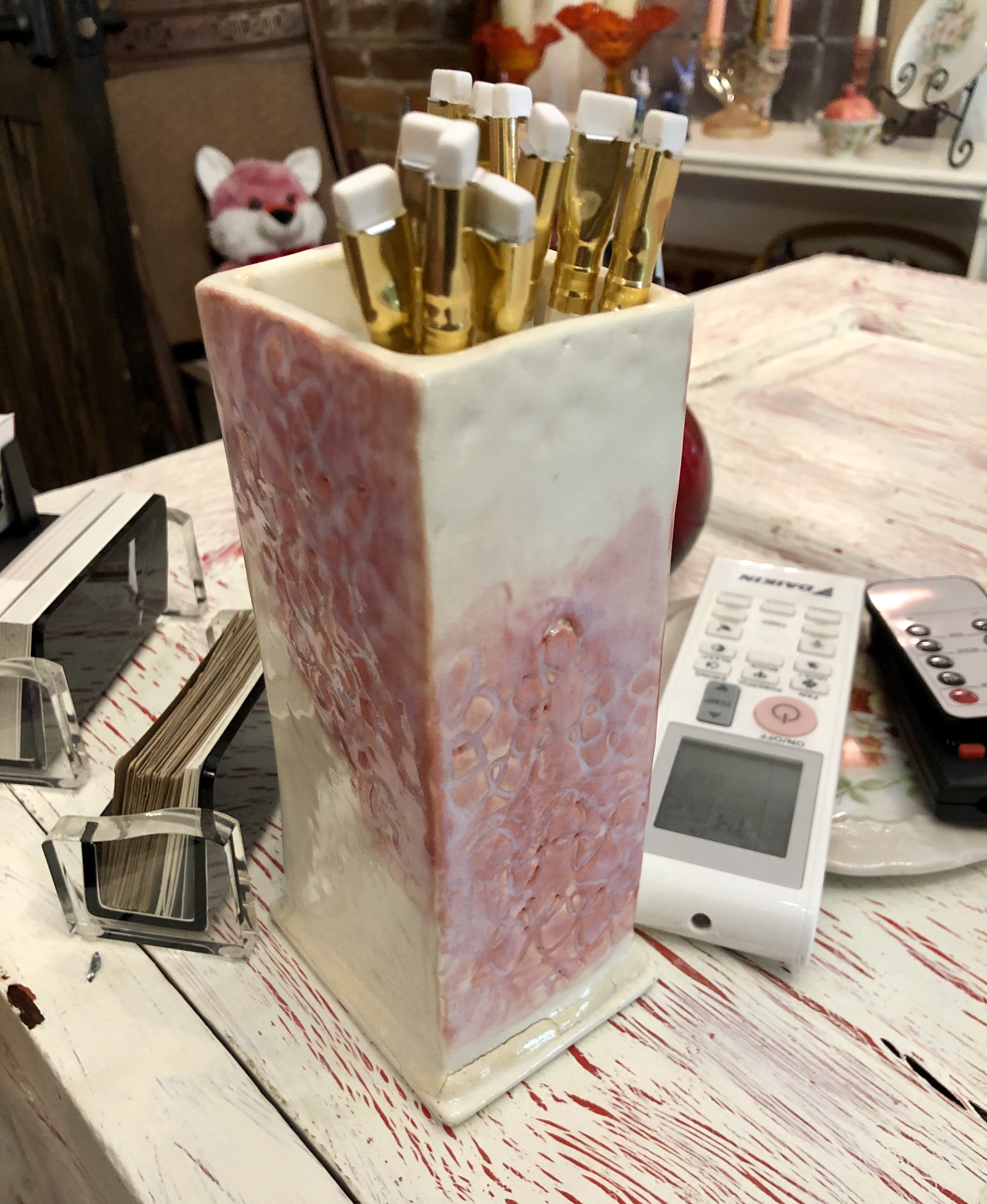 I also put more “shit,” as Chris calls it, in the office. These are some pretty pottery by my friend Pamela, which I got yesterday when I was prowling around her studio. I am especially fond of the pencil holder which is really a vase. It really sets off my fancy pencils. The little candle holder (or whatever) I got because it goes so well with the color scheme.