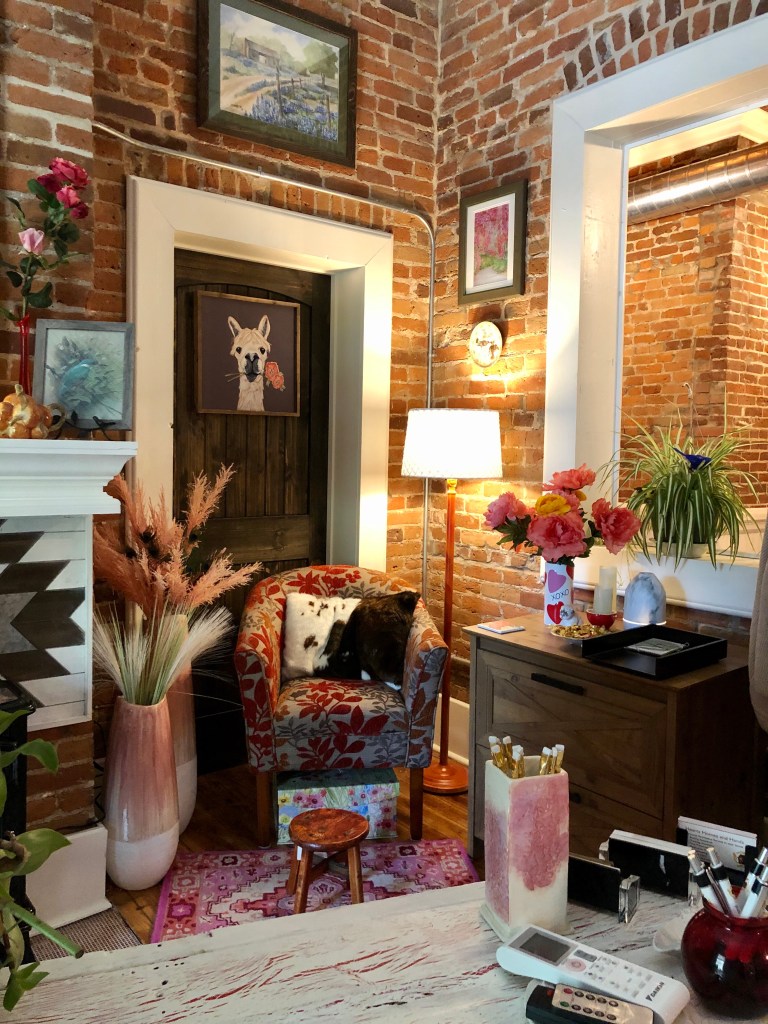 You’ll be proud of my restraint, since I briefly toyed with the idea of winding one of my colorful flower garlands up the stem of the lamp, but decided I have enough gaudy fake flowers in there. That place is not for the faint of heart!