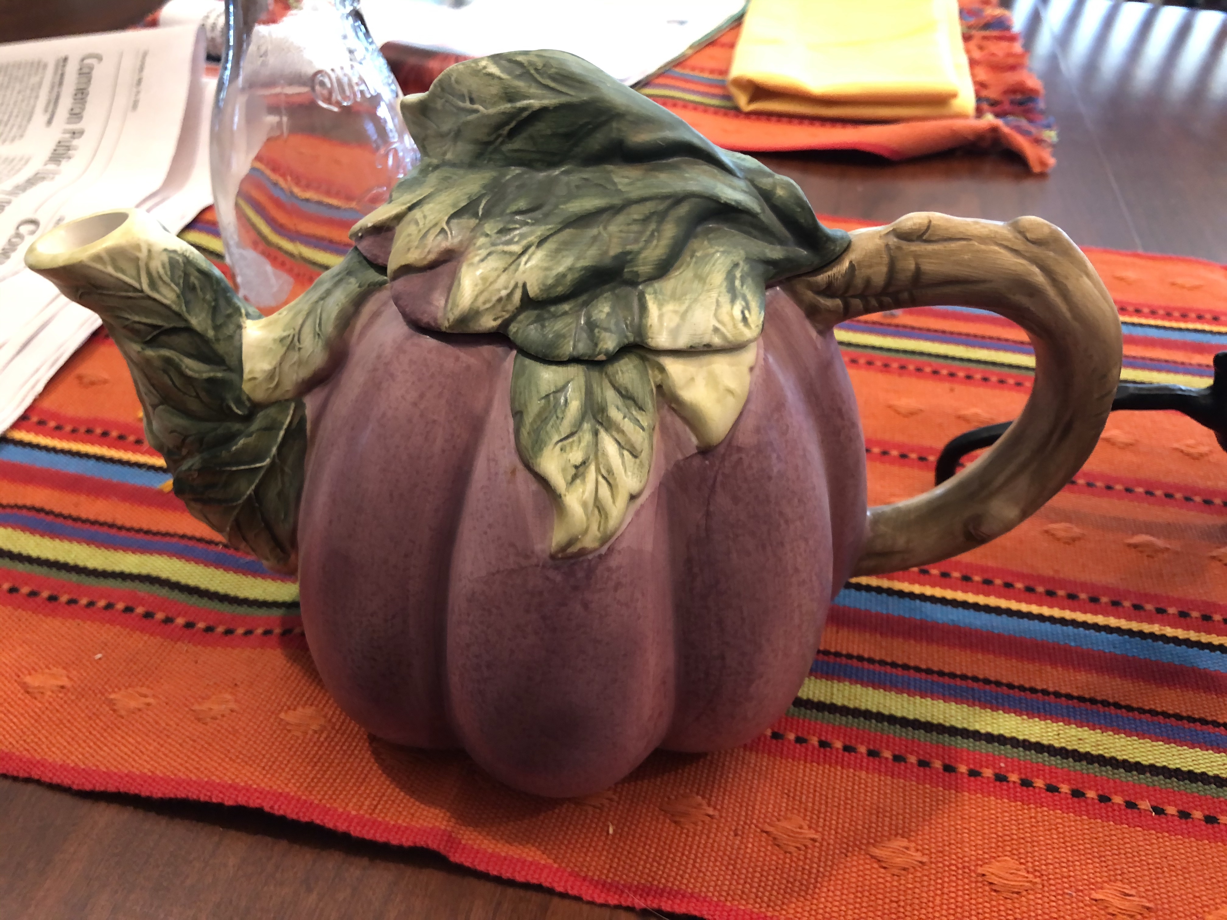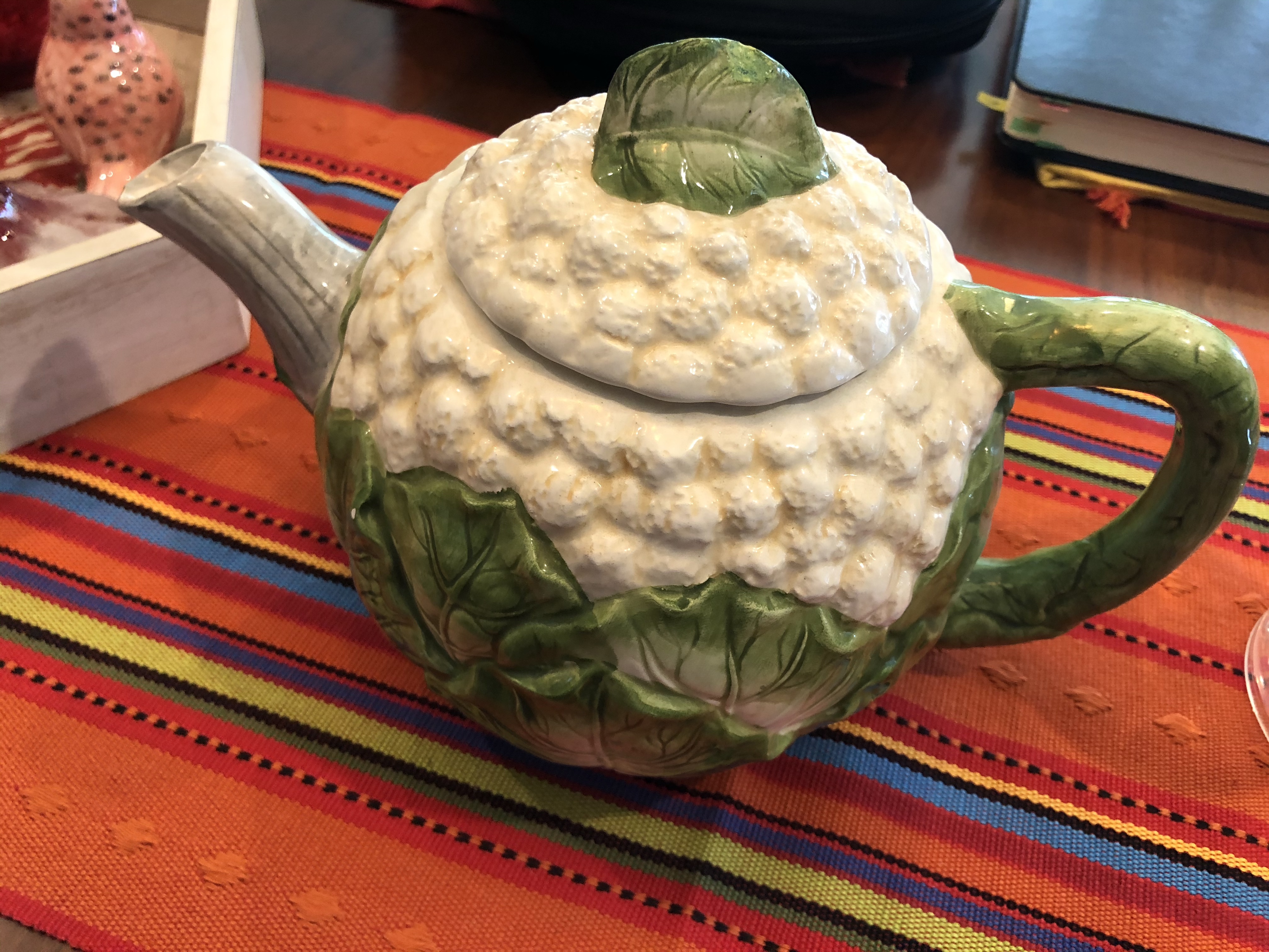 I also got three cute teapots for a collection I have: cauliflower, eggplant, and garlic. I left the garlic one at the office, so no photo. Anyway, I was amazed the ladies there recognized me with blue hair and a mask, but they did.