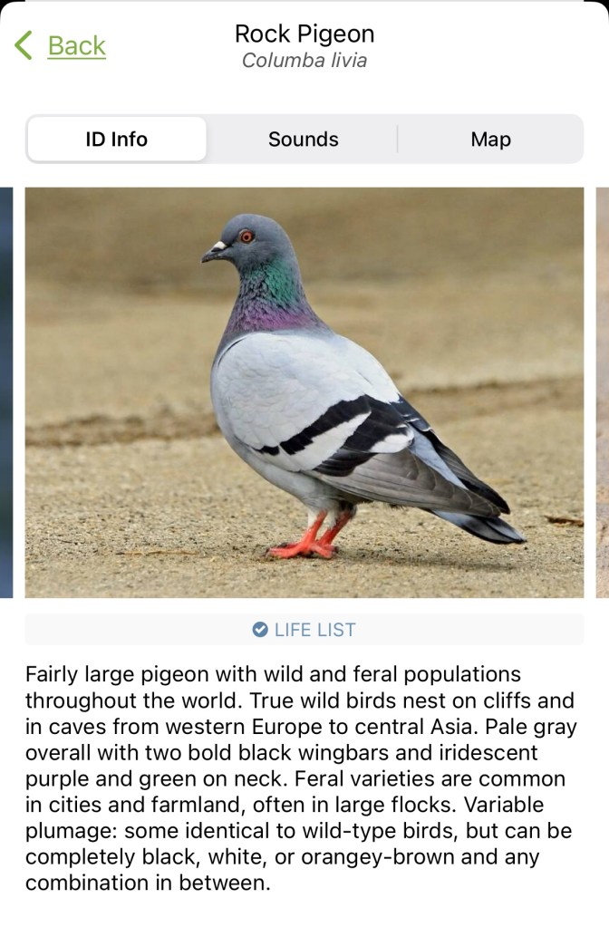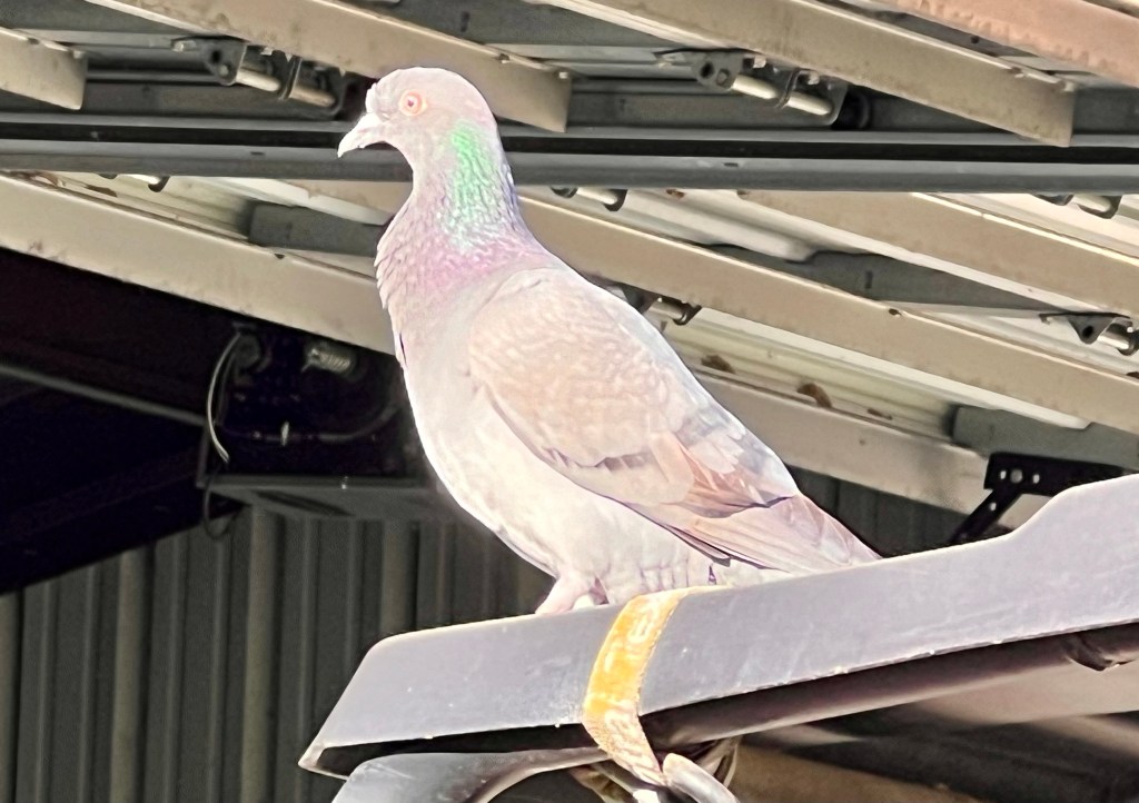 The pigeon never moved. Eventually it must have flown off, though. We see doves here (mourning, white-winged, Inca) but not often pigeons. Wonder where it came from?
