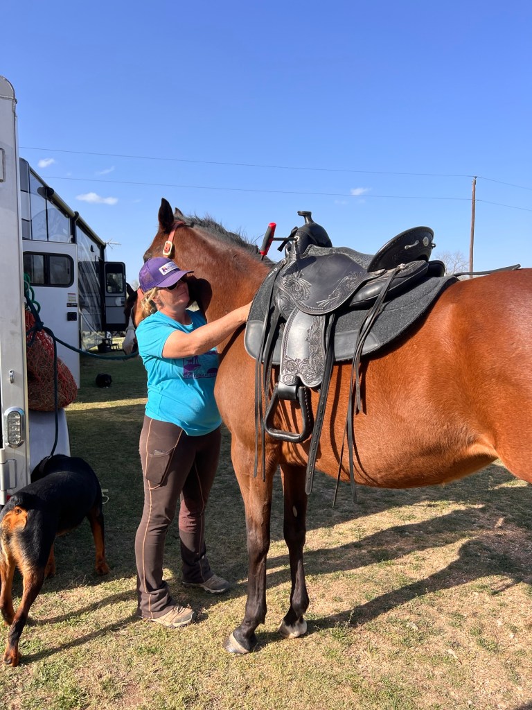 Before we left, Tarrin fitted the black saddle Drew had been using on Mabel’s shape. She has asymmetrical shoulders. Huh. Apache’s old cinch worked fine, so I can exercise her with the saddle to build more strength up. She isn’t ready to be ridden again yet, but it shouldn’t be too long.