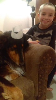 Sarge, 9 years old. He will let his boys do anything they want to him. They seem to love putting things on his head…