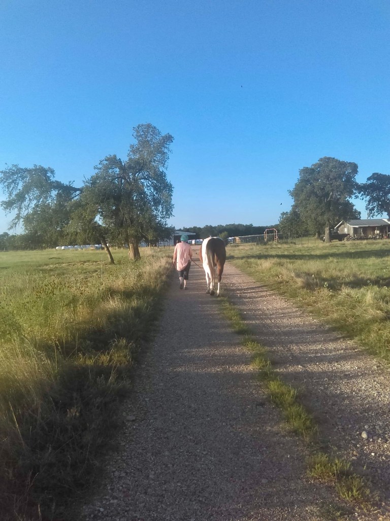 After that, we went for a walk (and dammit, my watch had run out of juice, so I lost ALL those steps). Of course, it’s always a parade around here, with Fiona and Vlassic both joining us. Apache was better walking than he was riding, but he kept turning back toward where he came from. I would lead him into a circle and walk forward more. He was also rushing, not walking with me.
