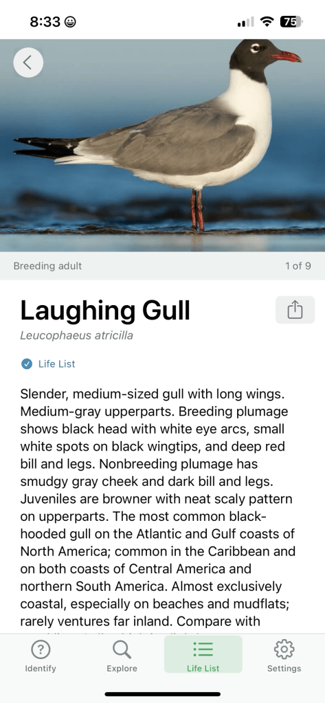 Well, I saw some. It taught me to believe Merlin Bird ID more than I did before. On Saturday, Merlin identified a Laughing Gull. I was dubious. I saw many in South Carolina on the coast, but I didn’t expect to hear any here. Of course, sea birds do pass over here, but never these.