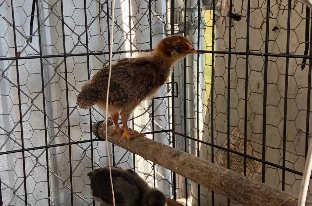 Now that the Black Chick and the Brown chick have reached the mighty age of two weeks, they have their own quarters. I took the opportunity at lunch to clean Star’s mess up, so they could actually see the floor of the cage, and get to their food and water. I have them both hanging, which means it is a lot harder to knock them over. The only thing is, I believe I have the world’s cheapest hanging chicken feeder and waterer, in the most flimsy plastic ever. I figure it will last long enough to get these guys into the bigger area (i.e., soon as they are too big to squeeze out of the fencing).