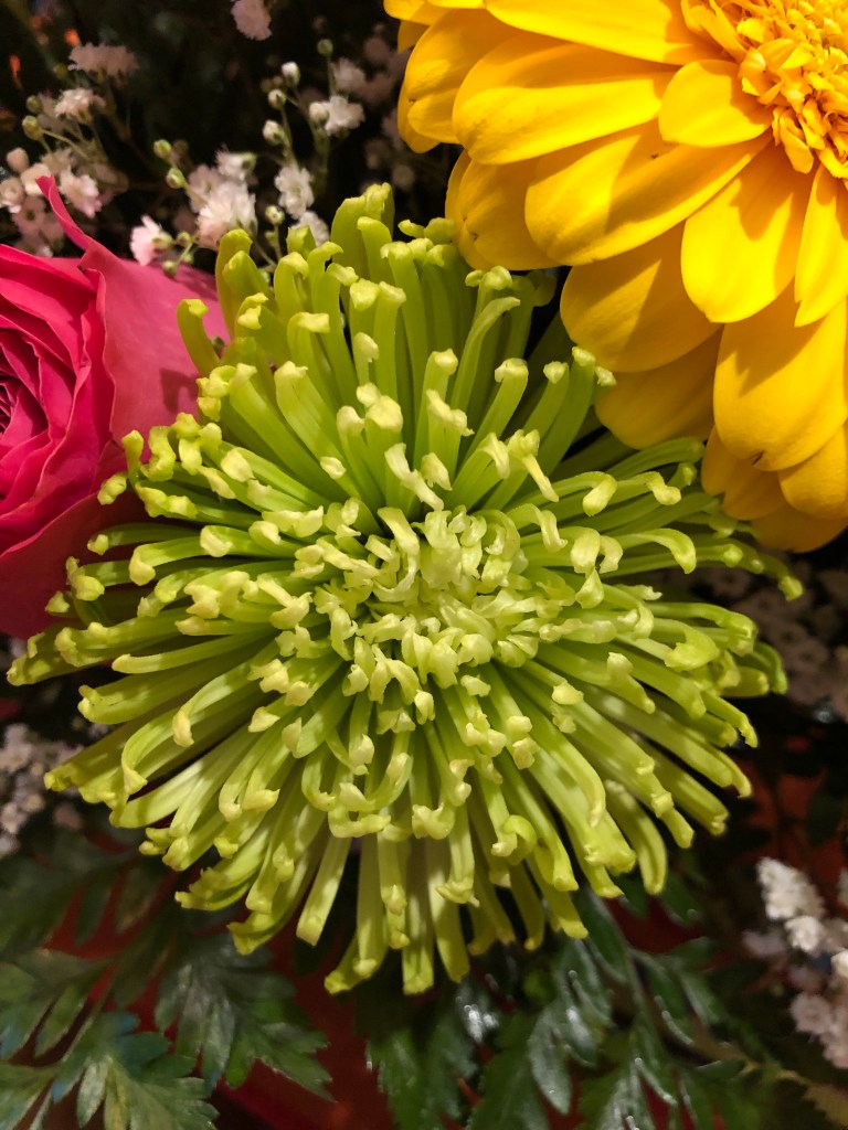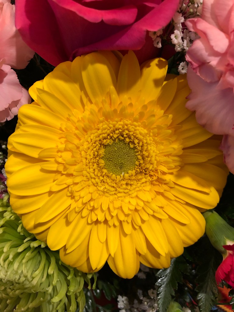 All I have is some happy flower images from the arrangement I got for Kathleen (the rarely resident niece) for her birthday. It was not too bright of me to assume she would be here that day, knowing how plans change so fast!