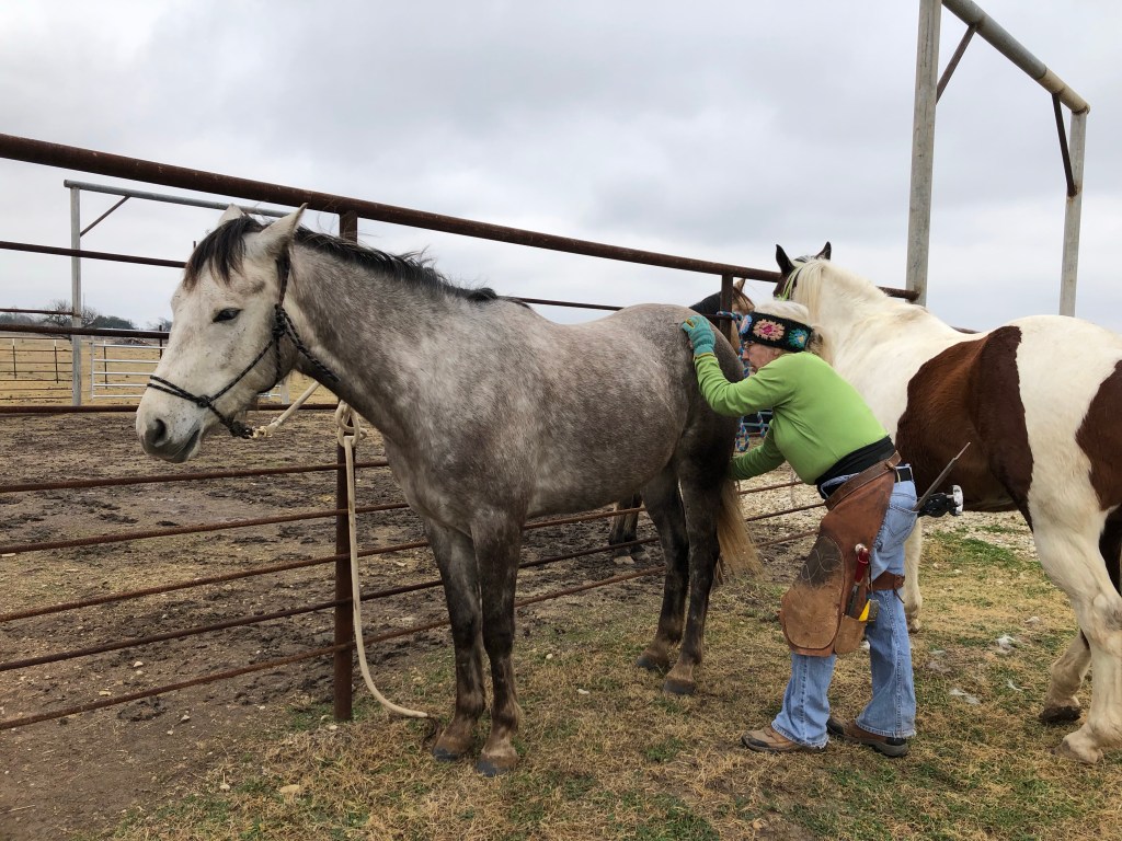 Actually, Trixie did all the work on the horses. Drew got a little body work and was medium well behaved for his hoof trim. Apache was good as gold, though, and we are happy to say his hooves are perfect.