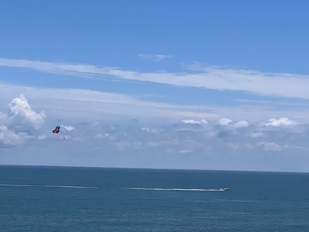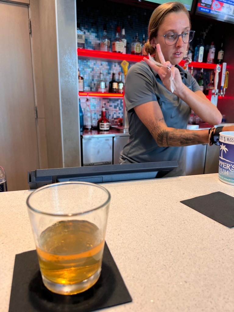 I did make it back to the Ocean Enclave and quickly downed two glasses of water. The pool bar was very pleasant, since it was shady and the breeze was just great. Well, it was pleasant for people sitting there. Sarah was really hot trying to serve a never-ending stream of people wanting their fruity drinks.You can make good money in the summer doing bartending, but it isn’t easy being perky while never stopping.