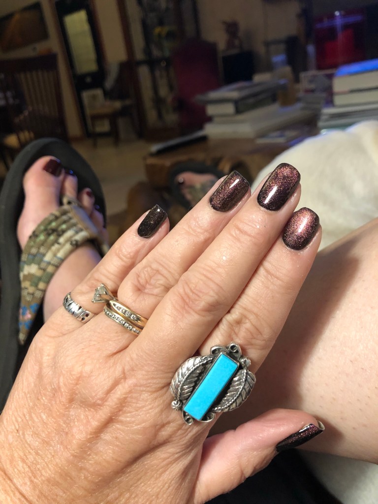 My nails also are exciting this week. I had been doing them in boring ways while some problem nails grew out, but this week I layered flowers over a nice turquoise color and got something that really goes well with my overly abundant rings. By the way, I am using the ColorStreet stuff. I find it works very well for me and lasts about ten days. I can even do nail repairs and it helps keep them looking fine. (I’m actually going to break down and do an MLM party for this stuff, just because some friends want to get some of the colors, and I could use some freebies.) I don’t like it (or anything) enough to sell it, but I can help some other woman make money, even though I am not a fan of MLM “small businesses” in general (here’s where I ranted about that once). The particular sales person I am using right now actually is a good marketer and has nail tips even I, a person who’s been doing her nails since 9th grade, didn’t know.