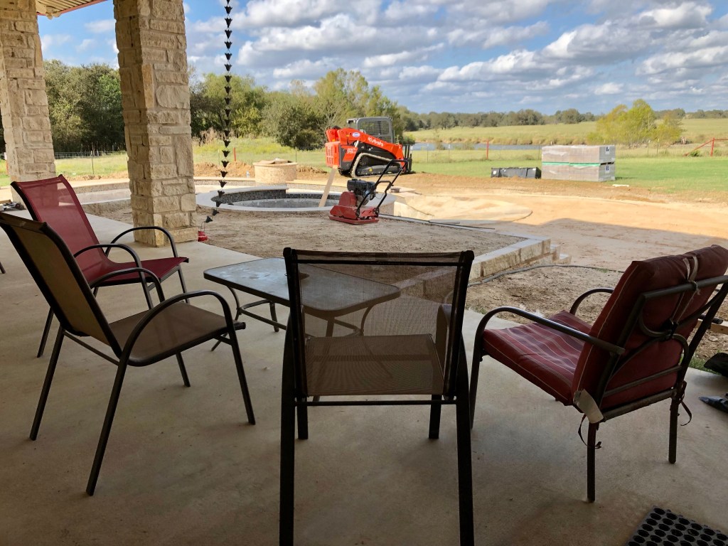 I knitted and watched football a while, then BOOM I got an urge to sweep the back porch. It’s gotten pretty messy with all the pool construction. I swept and swept a LOT of dirt and the inevitable bugs.
