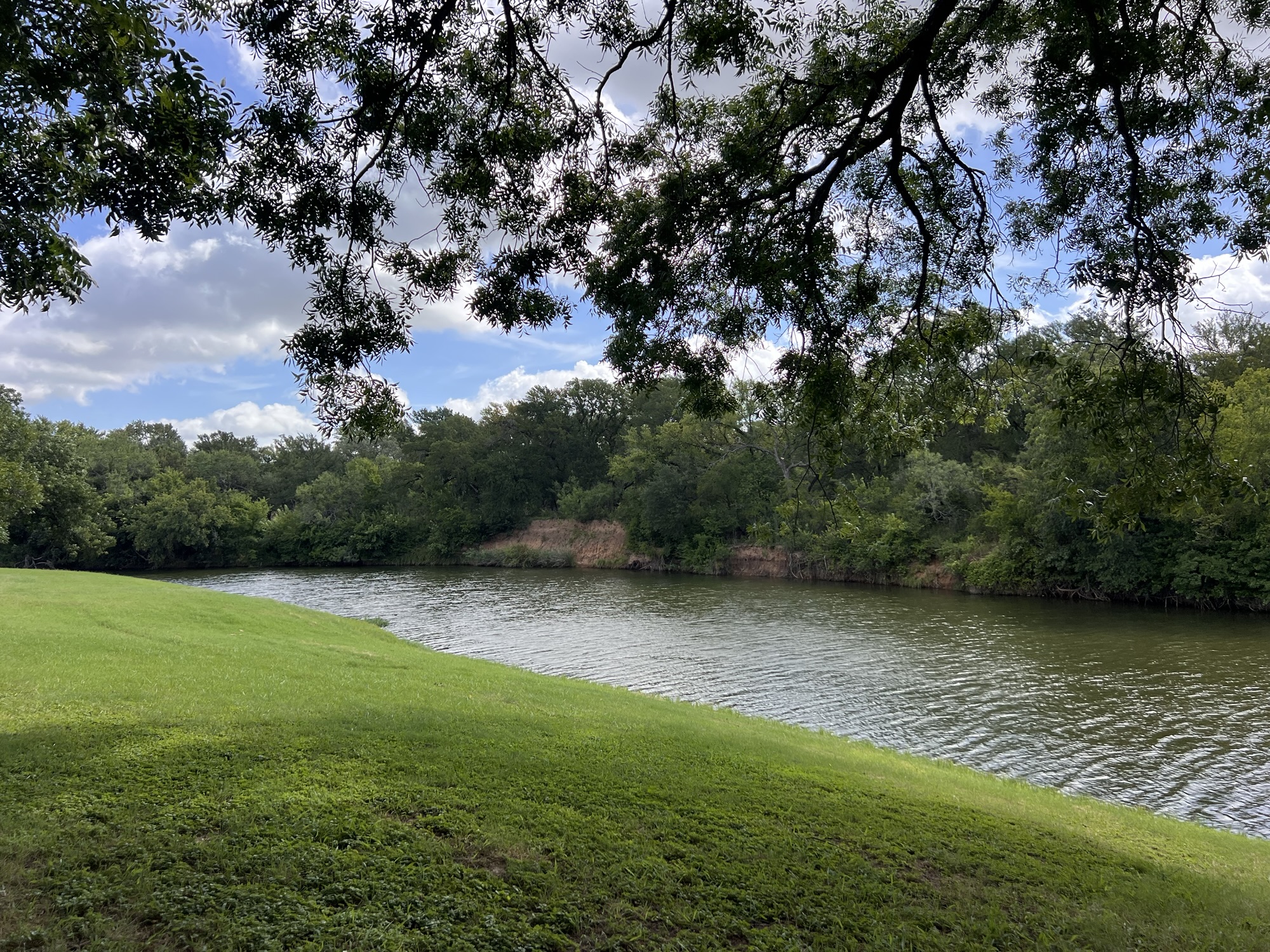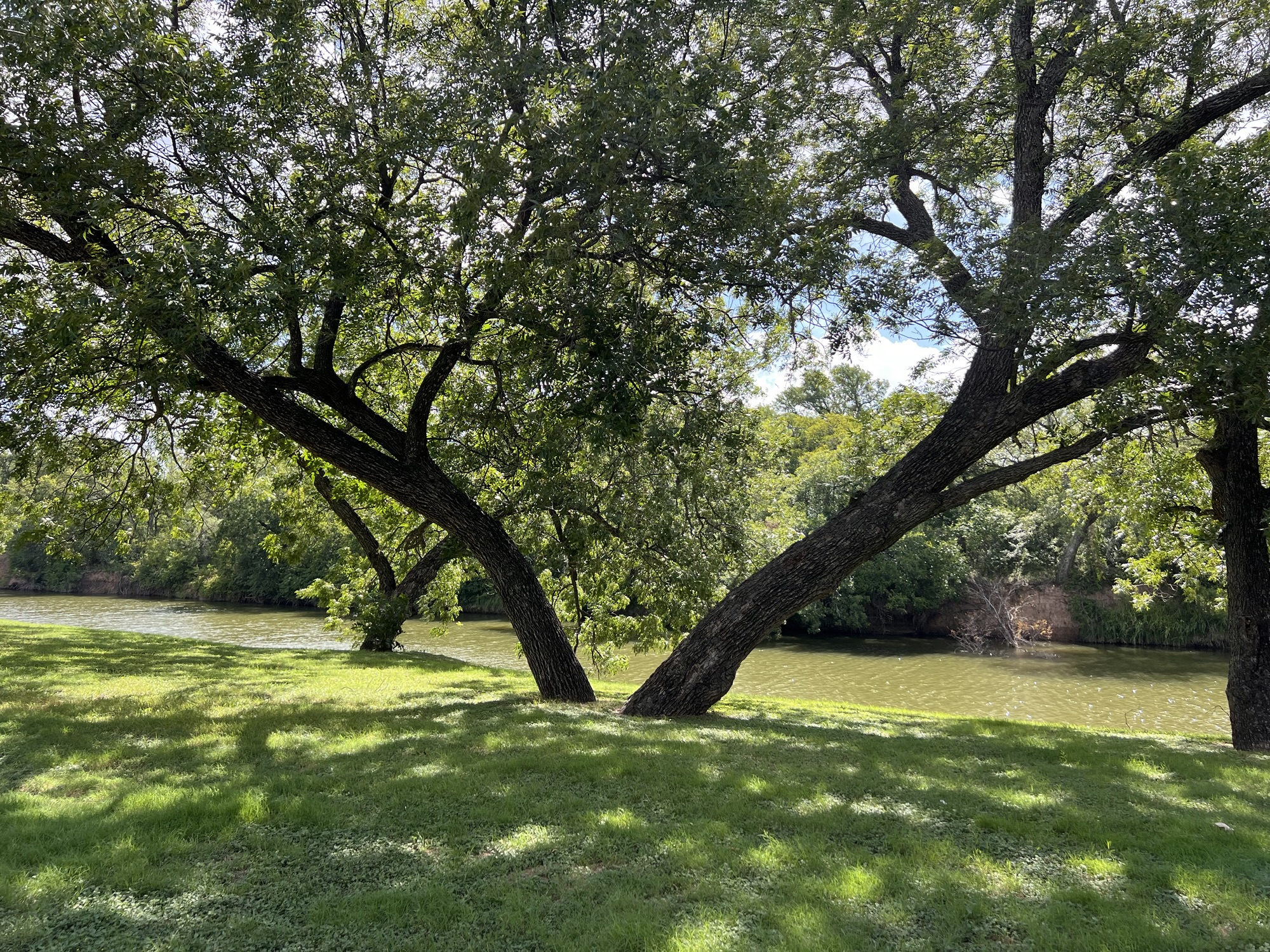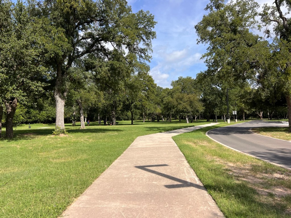 Even though I still had the wrong shoes on, I was able to happily walk the sidewalks that went along a pretty bayou (Pecan Bayou) and an adjacent woods. The park has a nice disc golf course, a beautiful playground and a cool meeting pavilion. It looks quite new, but is full of old trees, mostly pecan.