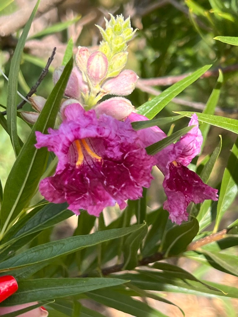 Gregg’s tube tongueOr Justicia pilosellaVitex, in a flower bedDesert willow in a flower bedFrog fruitDandelion Chicory of some kindShaggy portulacaPecan set in a firmer tree branchBlue-fronted Dancer
