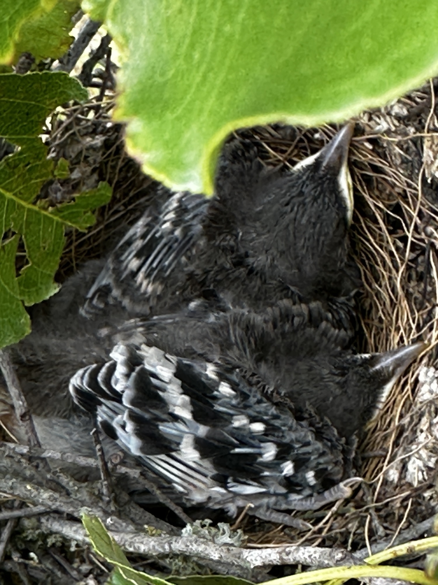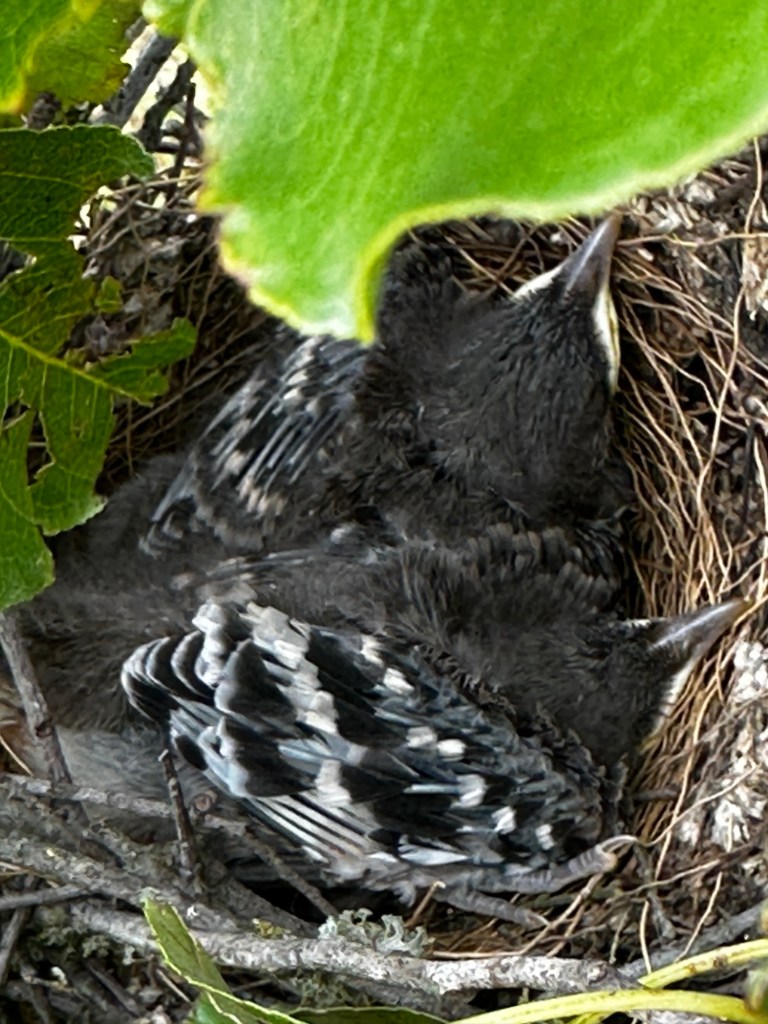 Lee got these pictures of the Mockingbird babies in our small tree. They look great!