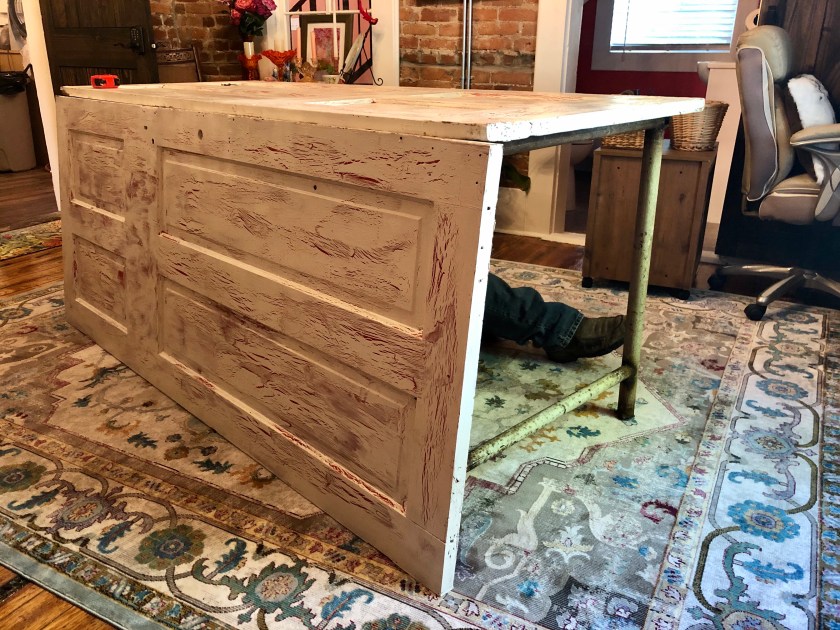 We still need to add the glass cover (very important to protect the delicate crackle job) and the keyboard drawer, for my typing pleasure. But, that can be done this weekend or Monday. I’ll use the small piece of glass on my current desk until the custom piece is made.