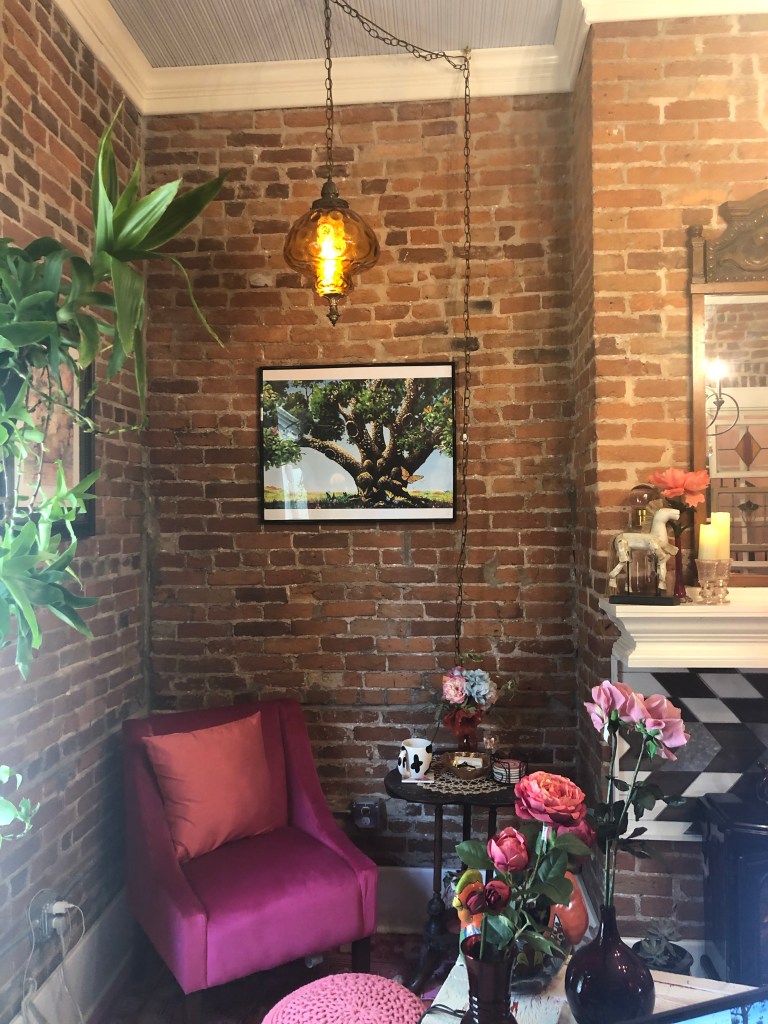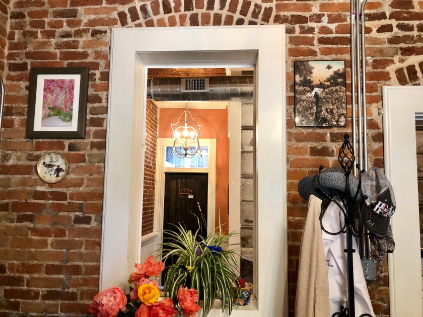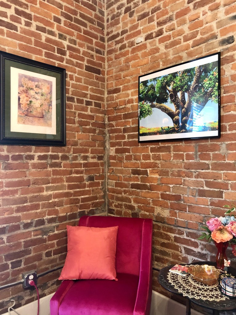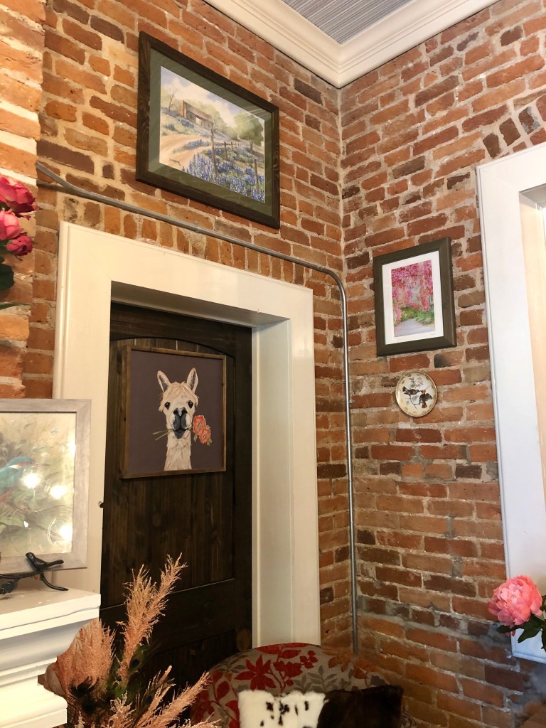 And while he had the drill in hand, Chris was kind enough to hang my art on the walls. That really helps the place look more finished! I have the cool glass hanging lamp I want installed, but it needs more chain, then all that’s left is the stained glass and shelves. These things take time! I’m honestly not trying to get it all done at once. I can work now, once we get the approval, and that’s what dounts.
