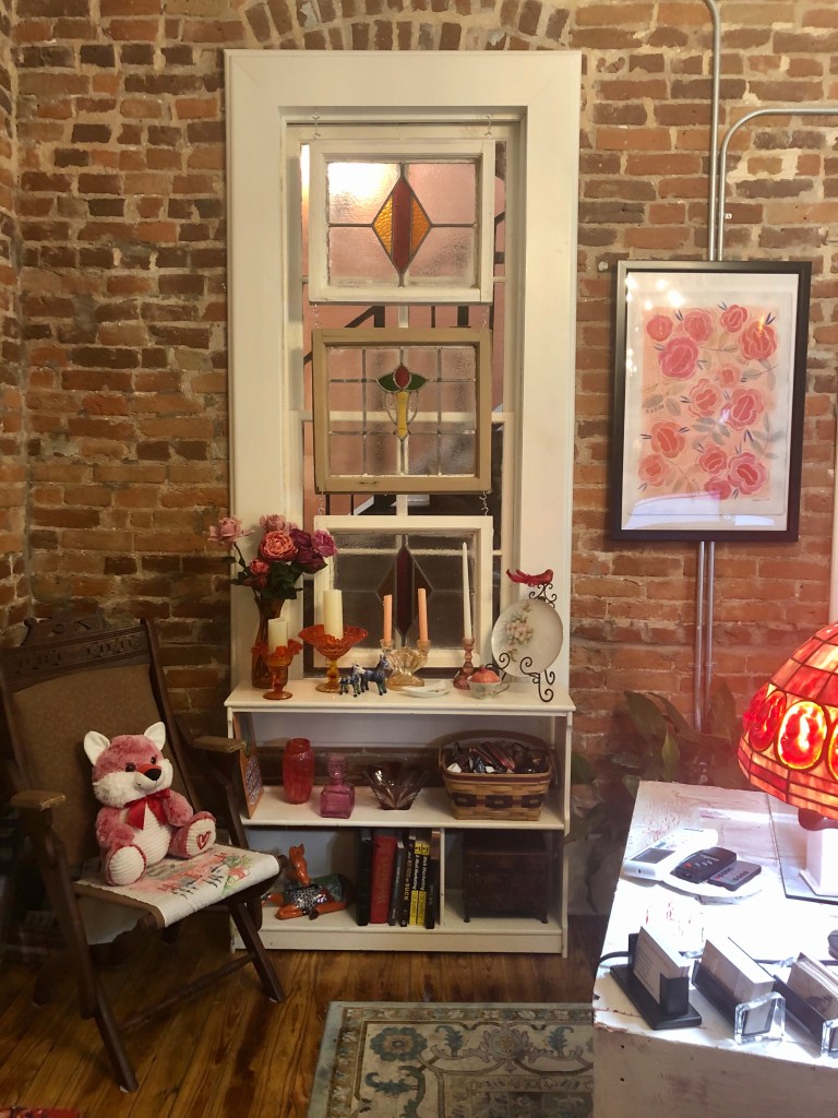 The last major thing I’d been waiting for in my Cameron office was glass shelves in the window that faces the hallway. I had visions of my red, orange, and pink glass collection shining in the window, and hoped the reality would live up to the vision. What do you think?
