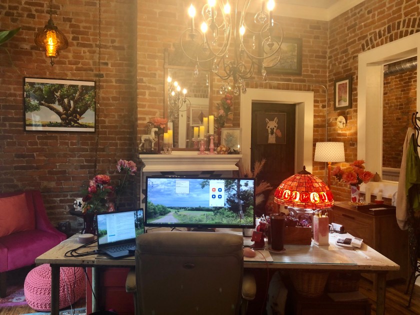 To start that fun off right, I made myself Zoom backgrounds so it will look like I’m in my new office. And I wore a cheerful shirt, plus lipstick!