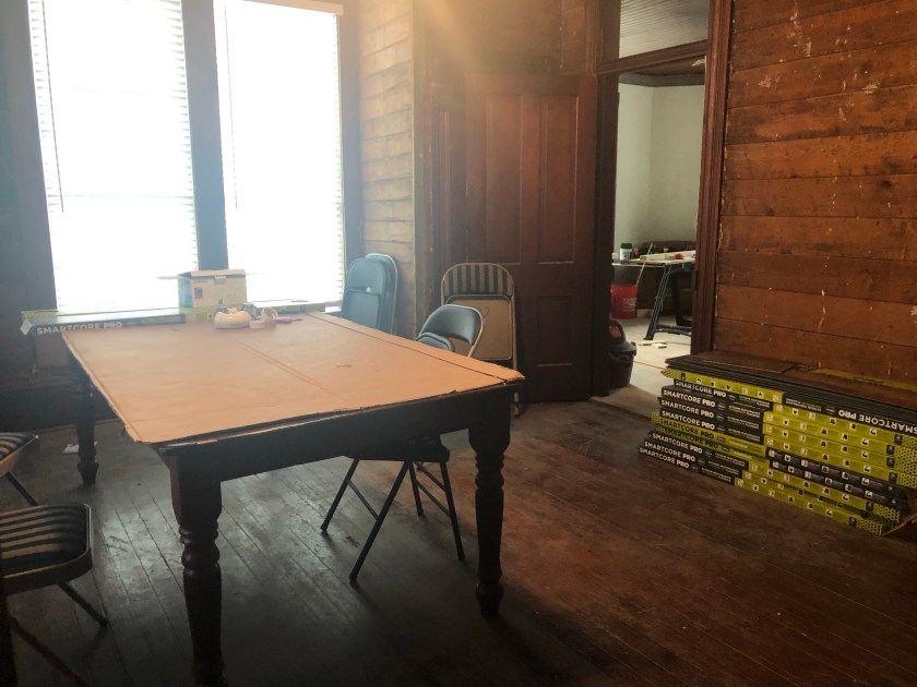 Before we could get that office going, we had to get a nice, strong sub-floor in the upstairs hallway. The next improvement will be to remove the weird kitchen-y room, so people can get to the balcony without going through the future conference room (you know it’s a conference room, because we put the conference table in there).