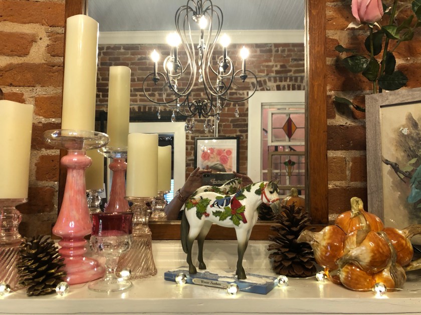 I did make my office a little more tasteful, with my newest Trail of Painted Ponies horse on the mantel and some other reasonable things. But, at least I got myself out of my rut and into a more cheerful space.