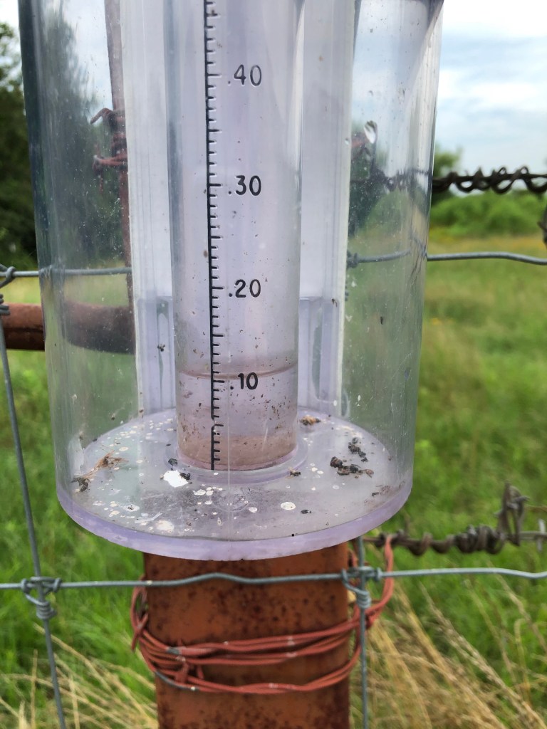 Rain may not be an exciting topic to many of you, but to ranchers in Texas, it’s pretty fascinating. The area where the Hermits’ Rest Ranch is located is midway between the very damp eastern part of Texas and the very dry western part. That means we get a medium amount of rain, averaging about 35 inches per year (according to Lee and my friend Lynn).