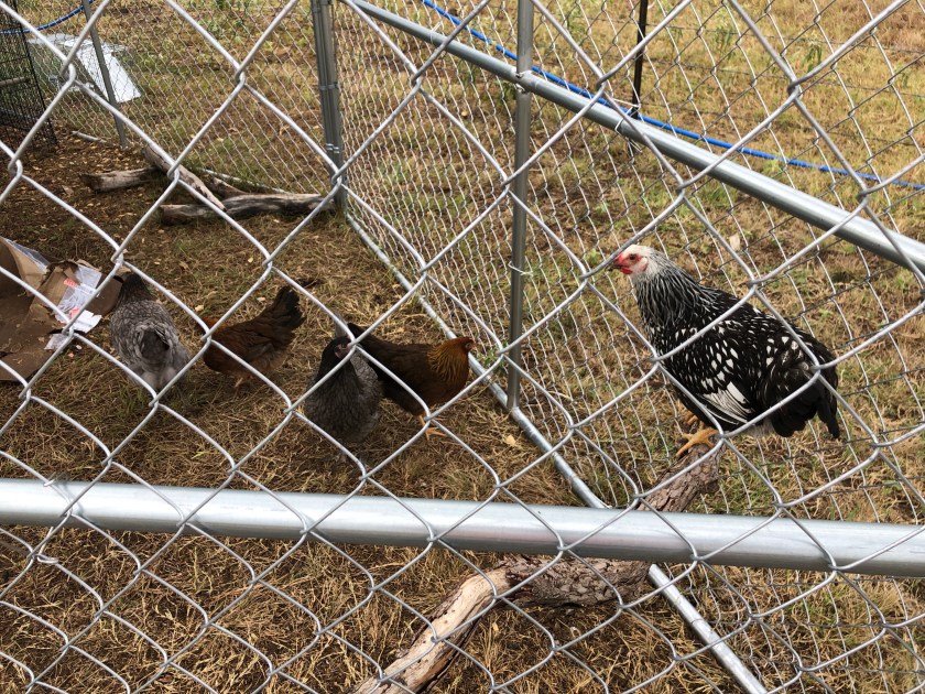 When I got home, I was not up for wading through mud to feed the horses, and besides, I knew they had food and water, due to all the rain (the grass IMMEDIATELY grew). I did check on the very wet chickens and their very wet food (I can’t open one of their feeders, so, it was all in a very wet bowl). As I was checking on the new chickens, Patty ran into the pullet area and wouldn’t come back out. She went right over to poor Henley (who still doesn’t look great, but she’s eating and drinking). I tried as long as I could do remove her, but failed.