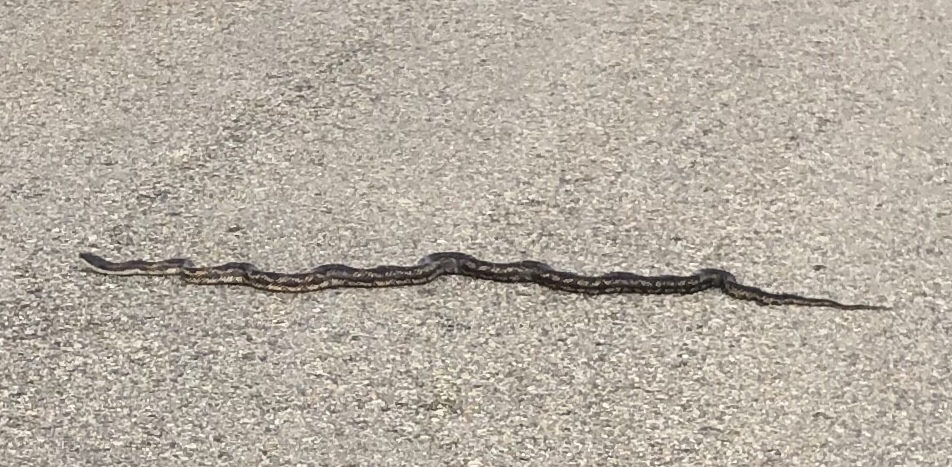 I came back later to see if I’d been left any eggs, and thought to myself, wow, that snake is really long, even for a rat snake (they get to be over six feet long).