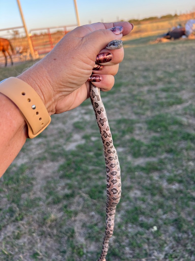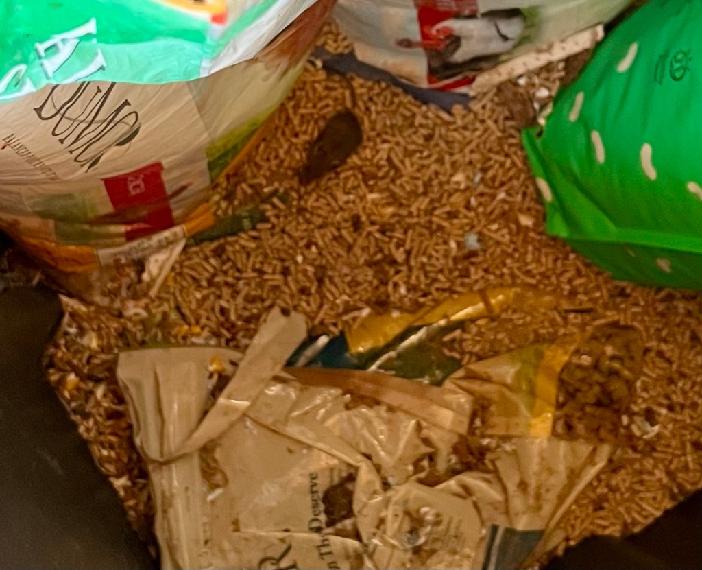 Well. Yuck. So, I took out all the food the mice hadn’t gotten to yet. One big bag I took out and emptied onto the ground. That’s where Lucky was hiding. That’s when I picked her up and took her over by the hay bales and let her go (former caregiver for a rat snake, so I have the skills).