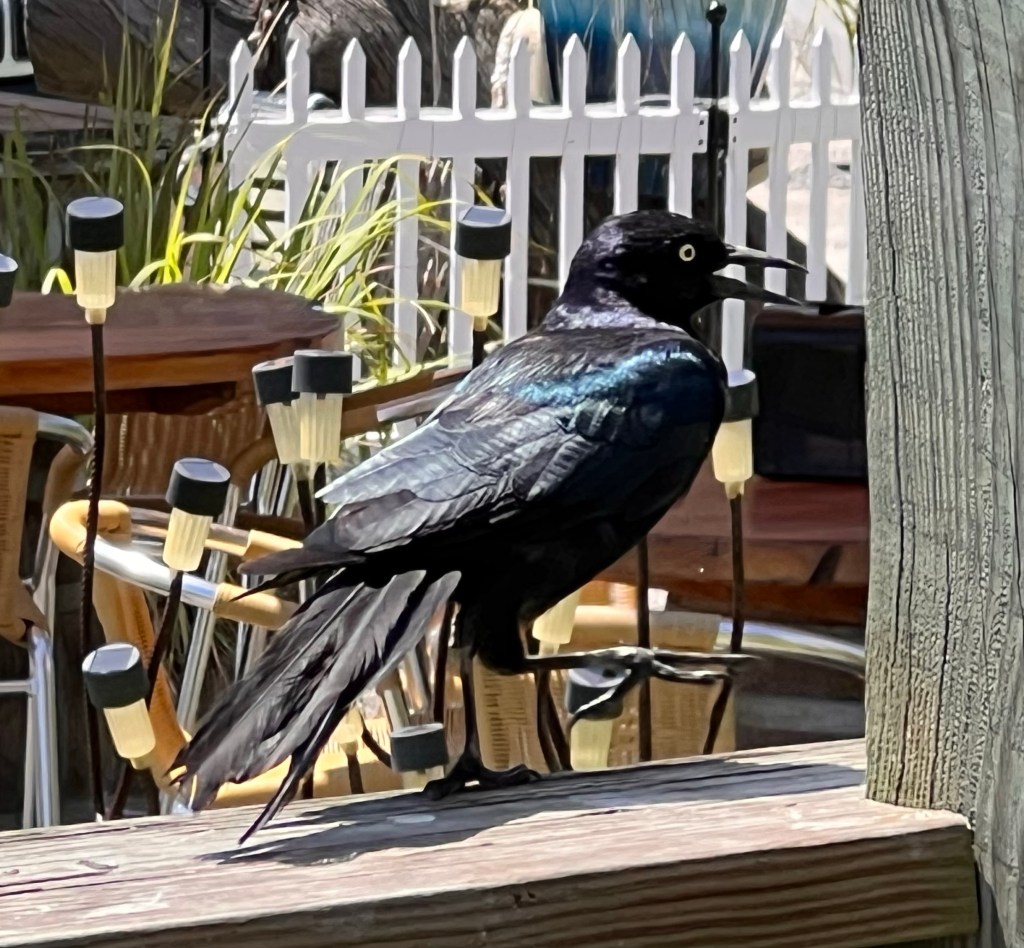 While the service was a little slow, I could not complain, since there was quite a show among the local bird population for me to enjoy. Grackles were mating and building nests, so they were in great form (and loud, being grackles).