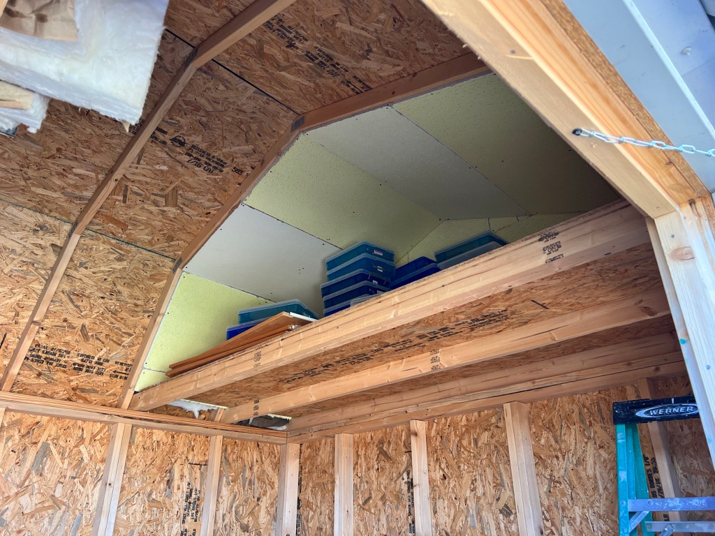 Once they got it all level, they started to insulate it, beginning with the ceiling. I guess they had some insulation left over from another project. They also began to put the old ceiling tiles from the church over the insulation, but it’s rather fragile.