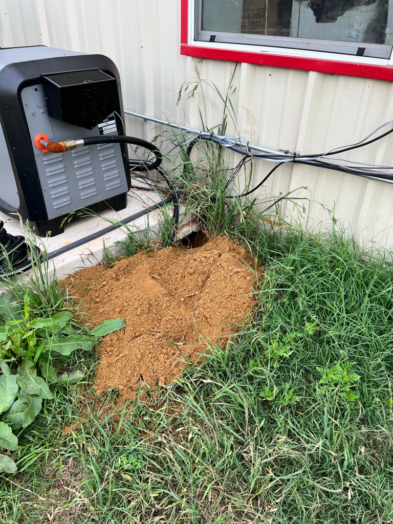 As I went to get a shovel, I noted a large hole under the pool equipment base. Oh goodness. The skunk was trying to build a burrow in the yard where the dogs live. Skunks aren’t bright, cute as they are. It was doomed.