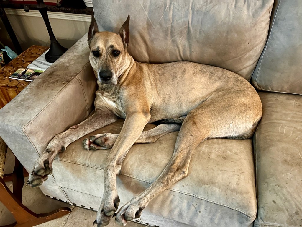 It’s already better after I’ve used Febreeze and Lysol. No, friends, tomato juice doesn’t work. We put dog-safe stuff on Goldie, too. I forget what it is.