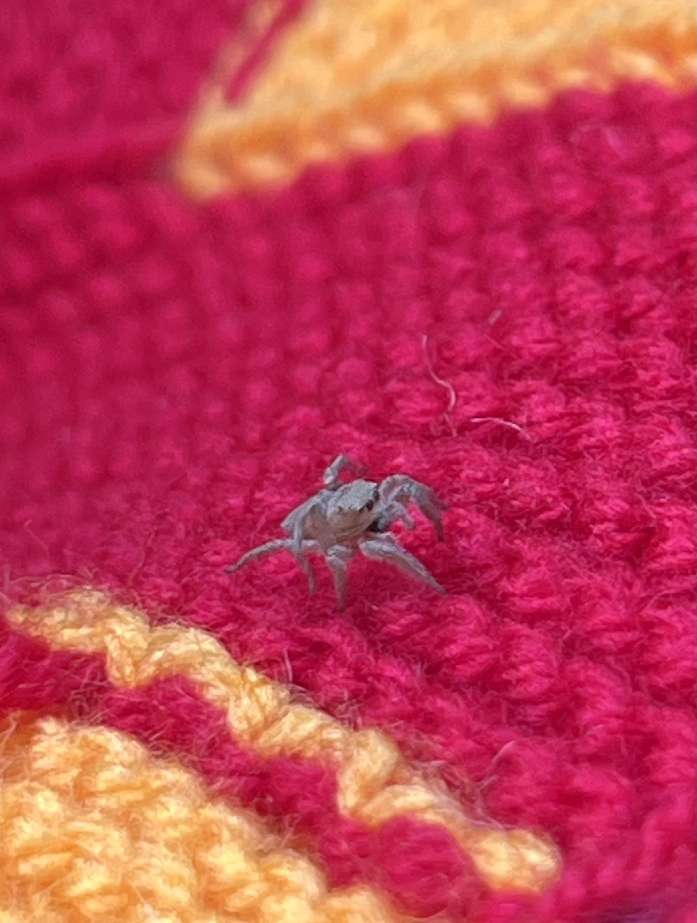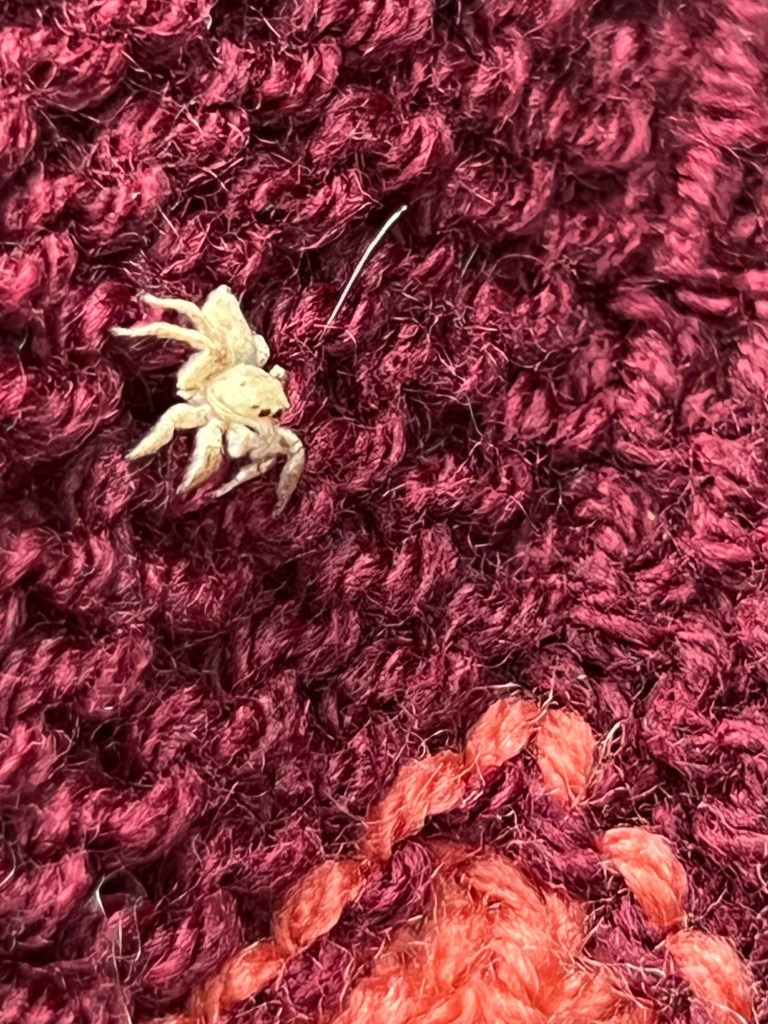 I worked much of the day, including before and after the drive, but I got a lot of knitting done, too. This little jumping spider decided to join me and hop all over my project. I sure enjoyed watching it moving its eyes and mouth and checking things out with all those legs. I think it was a paradise jumping spider (Habronattus coecatus) but I’m not sure.