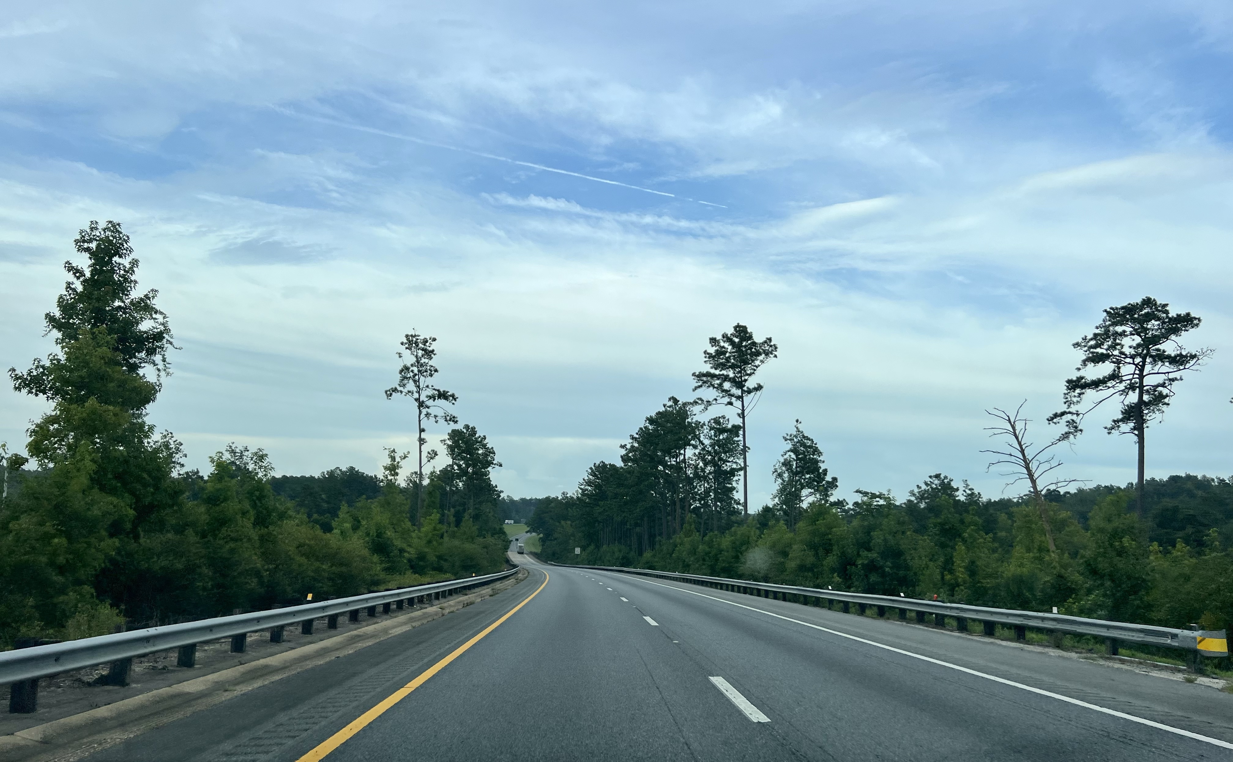 Much of the day featured interstate highways through commercial forests. It took longer than we expected, because there was construction and a big delay due to a horrible accident where a semi truck appeared to have slid sideways a long way off the road. Not a happy start.