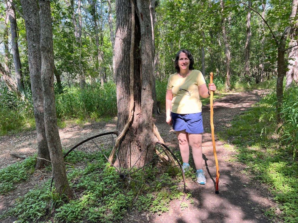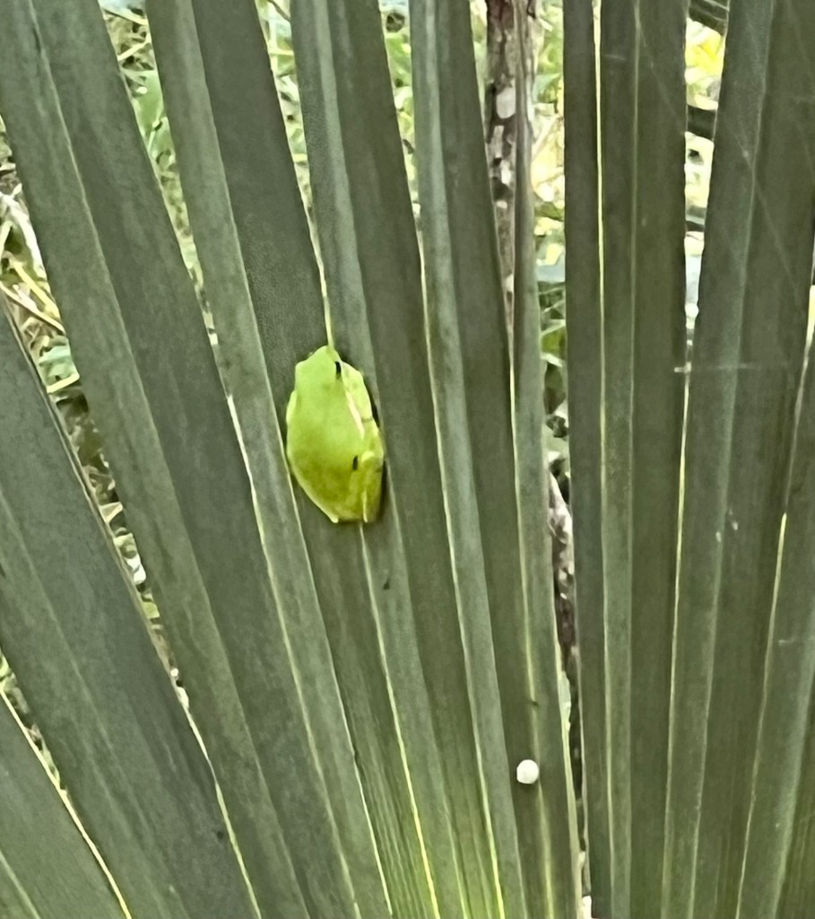 Luckily the morning walk was slow and easy, since we took Martha through the Palmetto trail to show her the pump house and the wheel with trees growing through it. I did okay then, distracted by cute frogs and butterfly chrysalises.