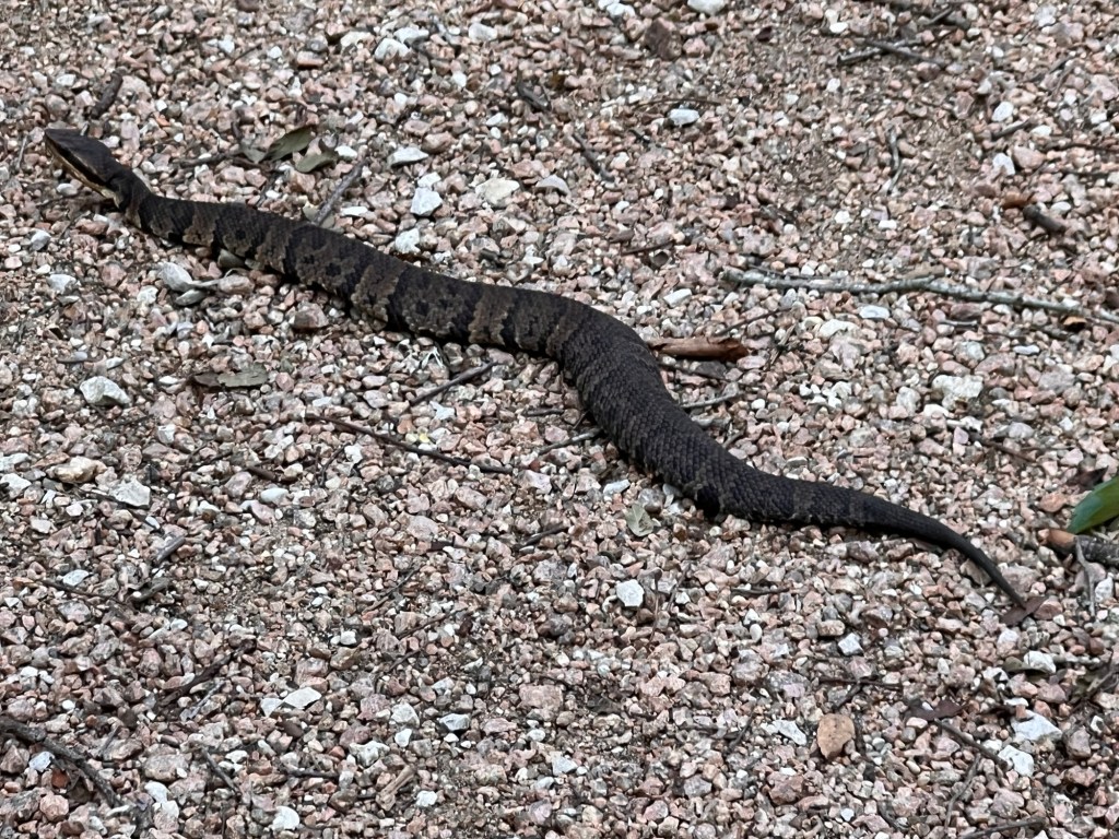 As for my day, I had a great morning hike between meetings and heard two new life birds, both warblers (America Redstart and Prothonotary Warbler). And thanks to keen observers who know my interests, I got to see a banded water snake in person and photos.