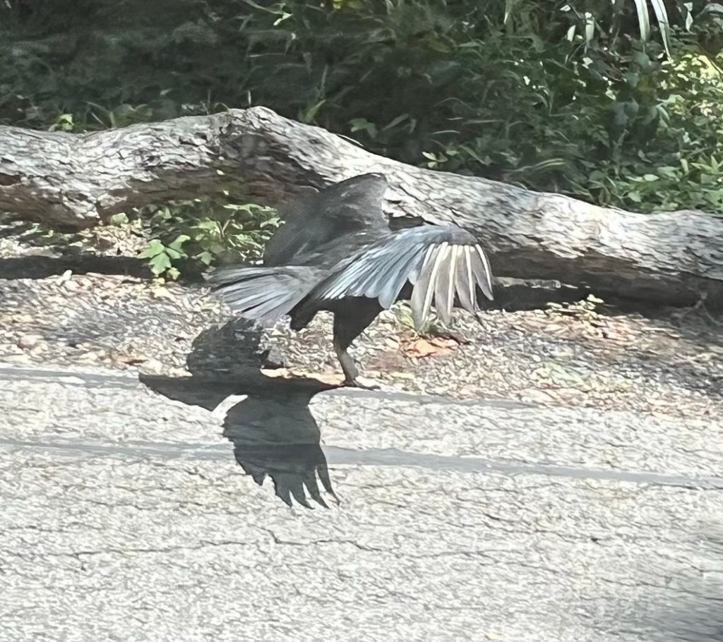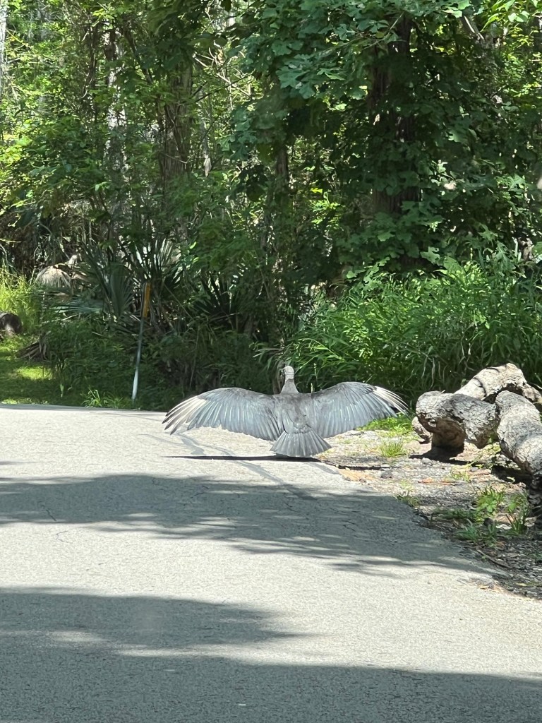On our way back to the campground, Lee suddenly stopped, and I soon saw why. A huge black vulture was sunning itself on the roadside. It looked so regal. For once, my photo through the windshield did the subject the justice it deserved. I love the images!