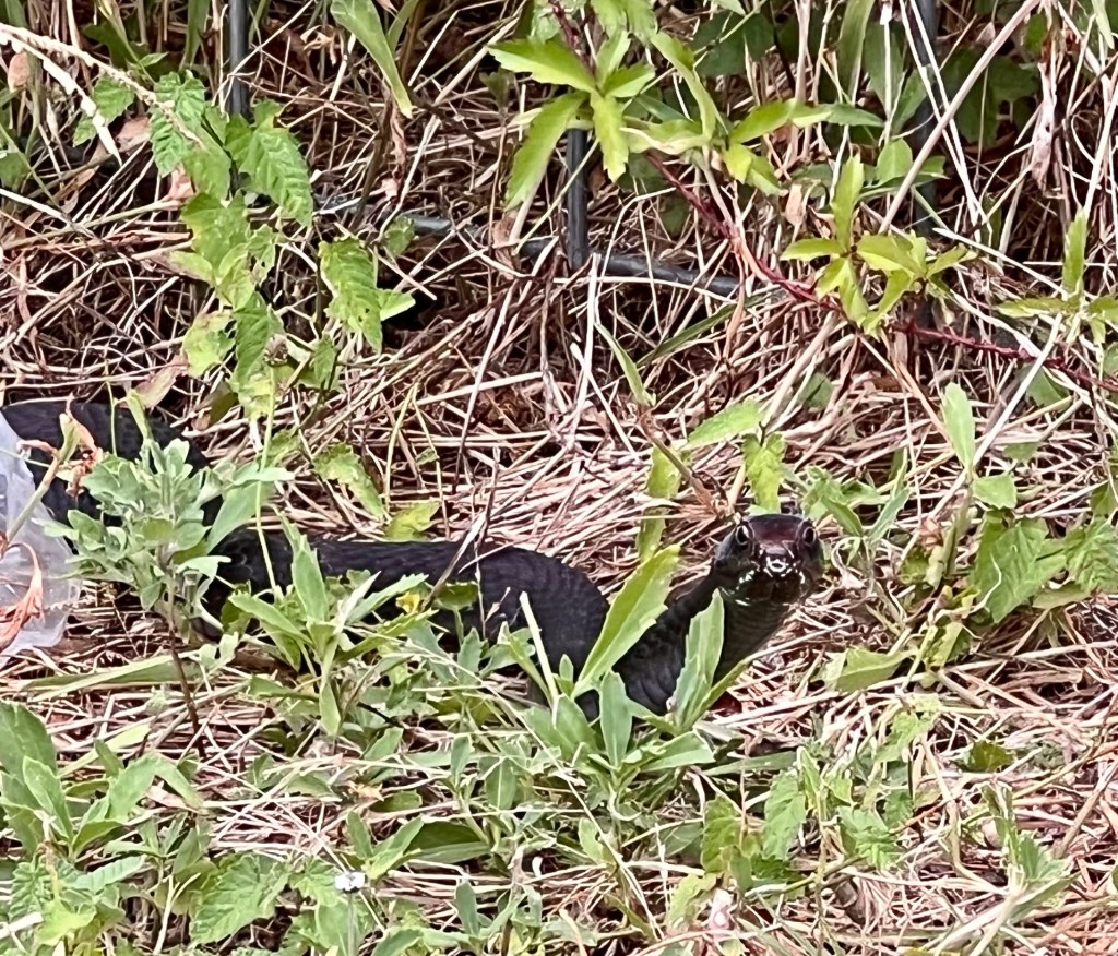 It stopped at the gate and paused, looking at me with its bright eyes, then headed on its way. It just said, “Hey, snake.”
