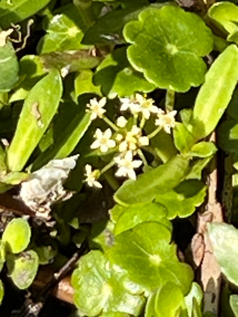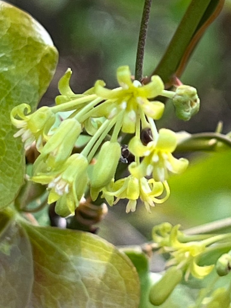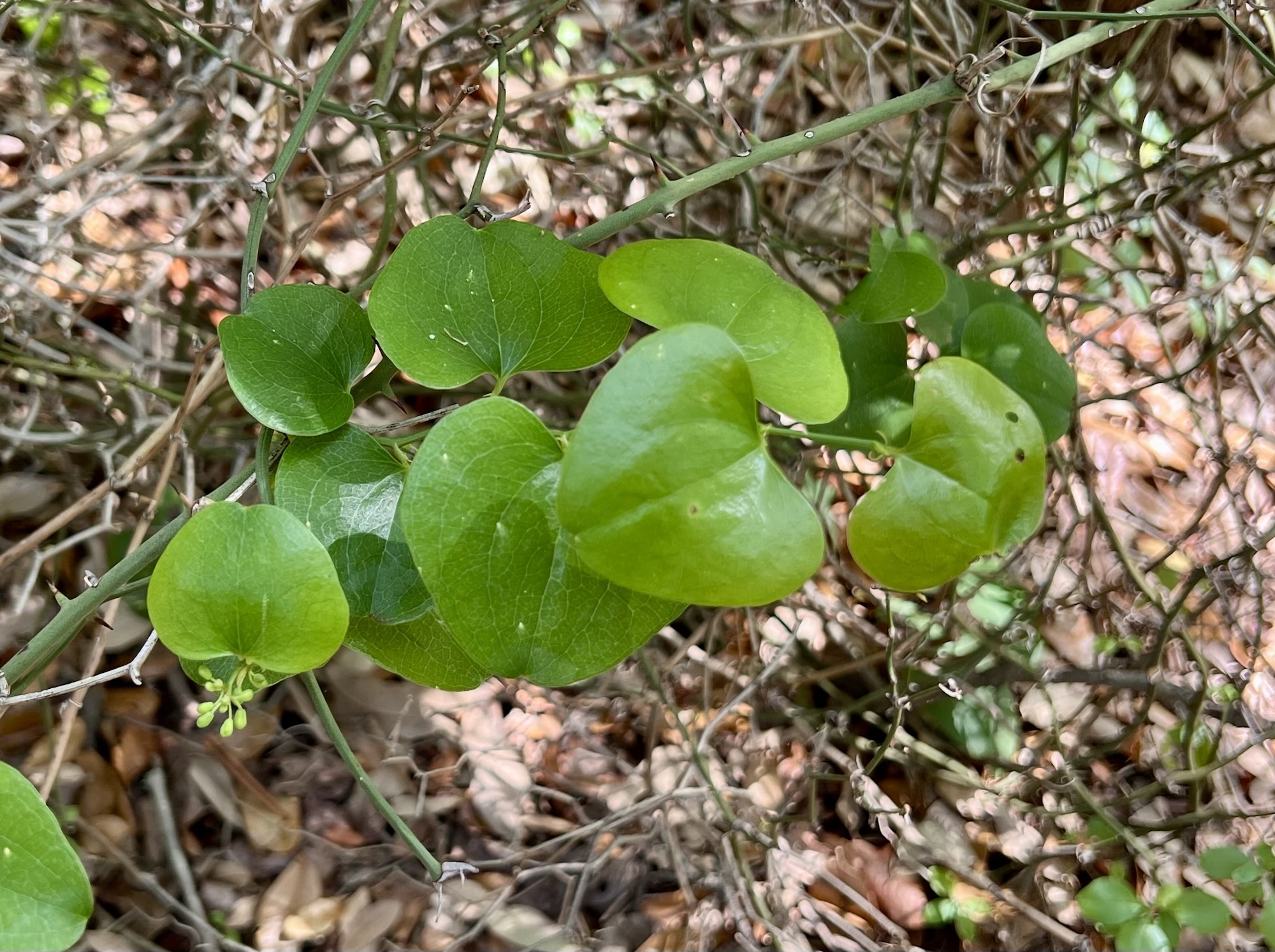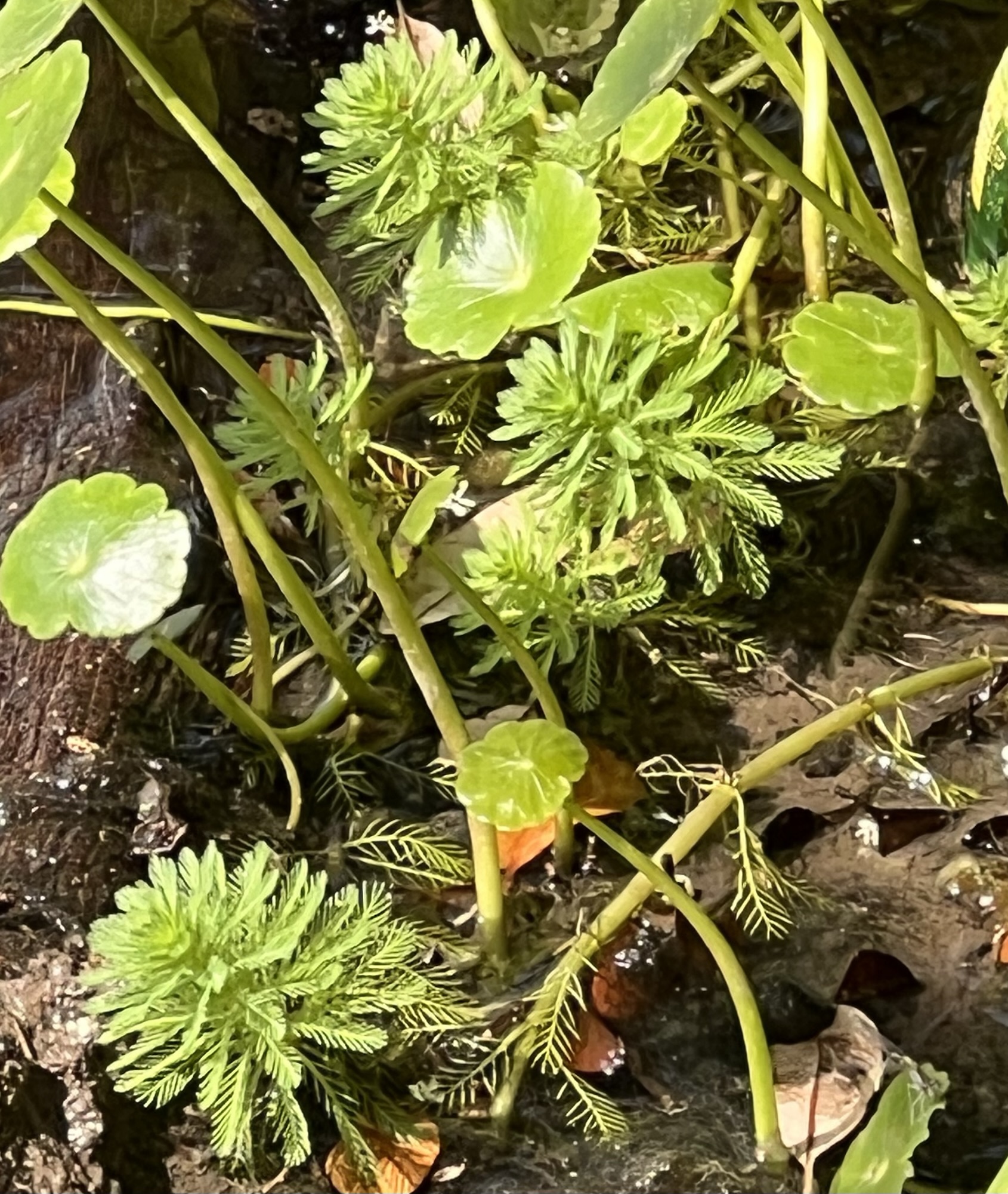 Smilax rotundifolia or Round leaf greenbrier Flower of this greenbrier Many flower marsh pennywort Hydrocotyle umbellataFlower of pennywort Pearl milk vine Matelea reticulataParrot’s feather Myriophyllum aquaticumSome kind of sedge