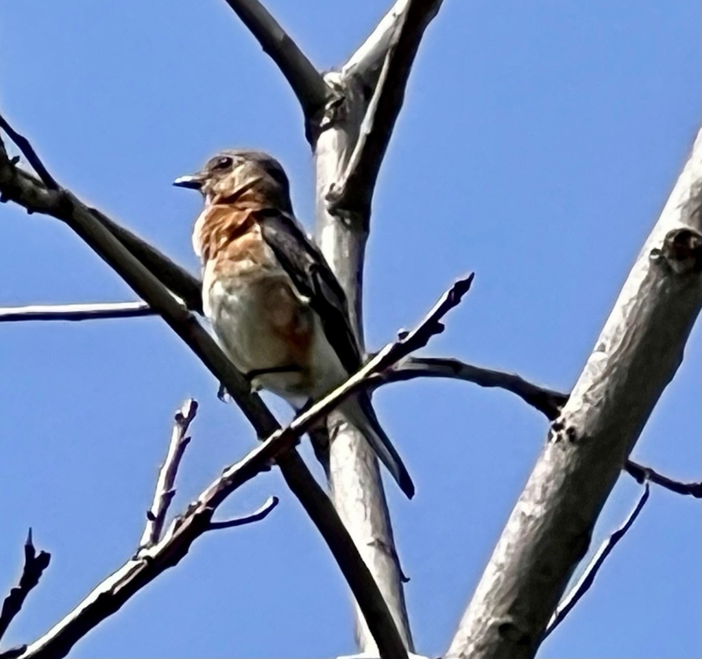 Titmouse looking downFemale Eastern BluebirdActing shy or itchy The male bluebird appears to have pooped. White ducksLincoln’s SparrowMockingbird