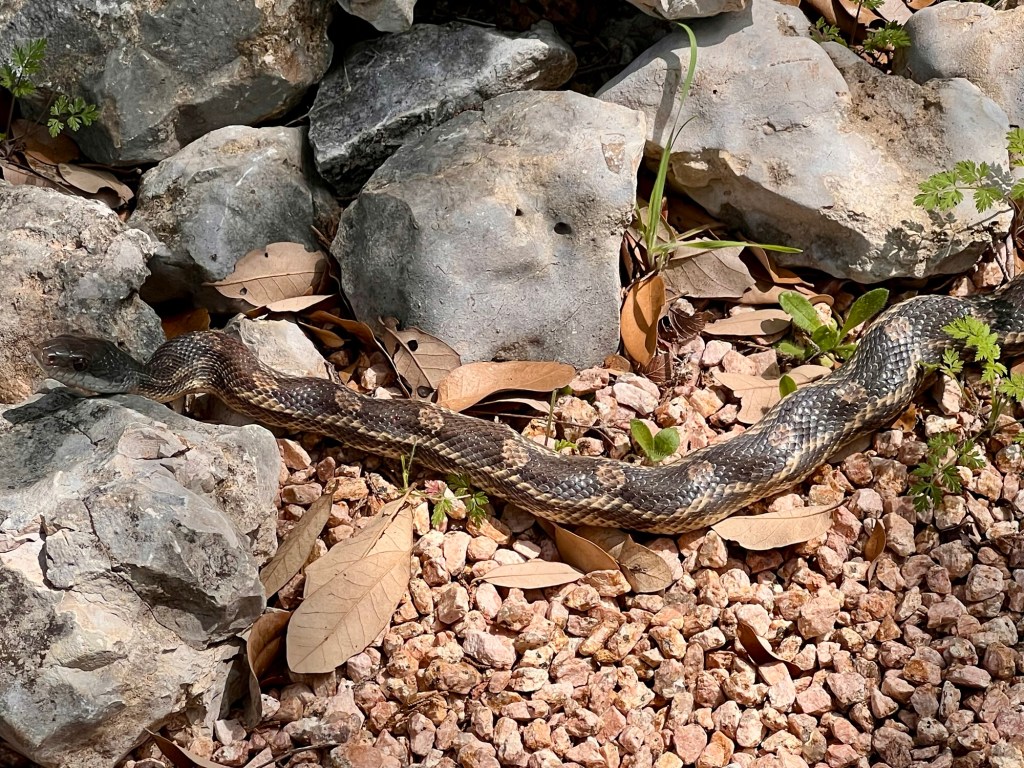 This one was near the dump stationNote stripes on its chin., a sign it isn’t venomous. This one Mike saw by his campsiteCloser