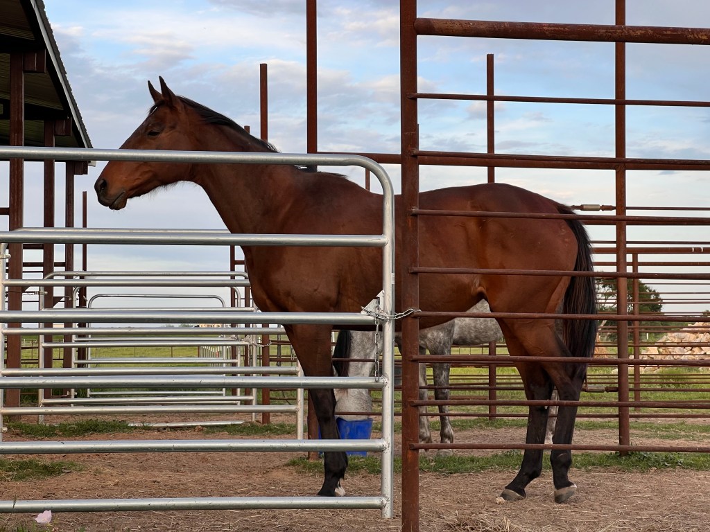 So, Plan B was to at least do some ground work. We did get some done, but when he slipped hard jumping, I ended that. I sure didn’t need to get him hurt. So he went into a pen to await his food. What did he immediately do? He rolled. At least it was in dry dirt.