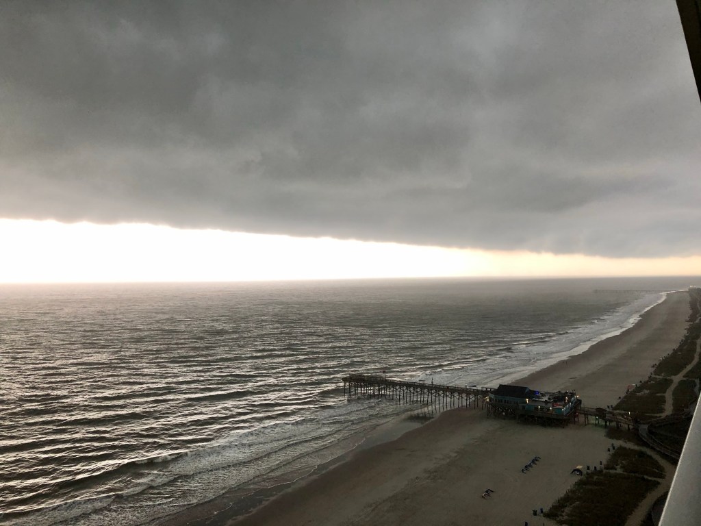 It started to rain, and it got as bad as rain gets in a hurricane, along with similar winds. It was quite a show outside the restaurant windows. Then things went downhill when the kitchen had to stop making hot food, then some roof collapsed in the convention center part of the building. Water was pouring in.