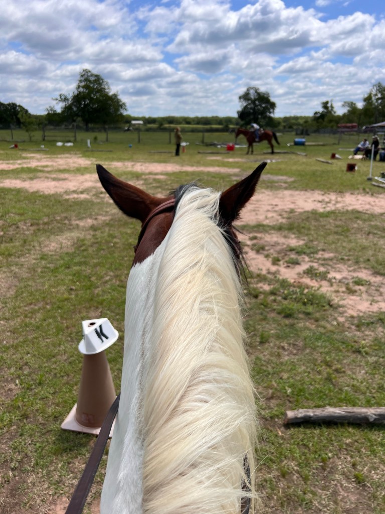 After relaxing for a while in his luxurious (in his mind) stall, Apache came out to do our part of the clinic with me, and he was an absolute dream. We started out learning the newest dressage pattern that we’ll use in the next shows. We did it really slowly, stopping between each section, to help the horses pay attention to our cues. I enjoyed doing it as well as watching the other two riders in my group, one of whom was just starting out on her horse after training.