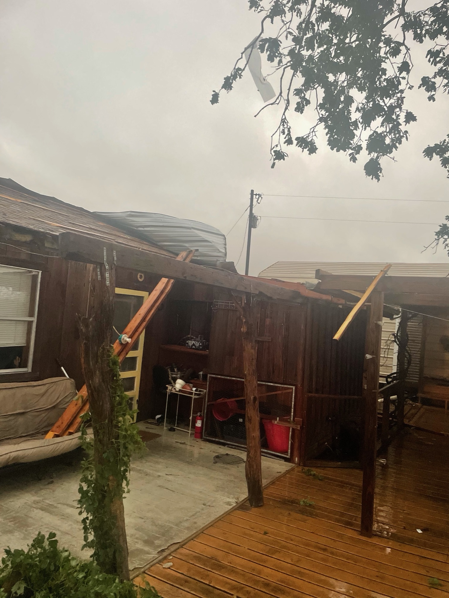 Roofing blew off the cabin where my son lives, and the material covering their patio is now in Sara’s horse pen. Glad we have the RV where they can stay until repairs are made. A tree fell on Sara’s horse trailer, and Mandy’s balcony rail is gone.