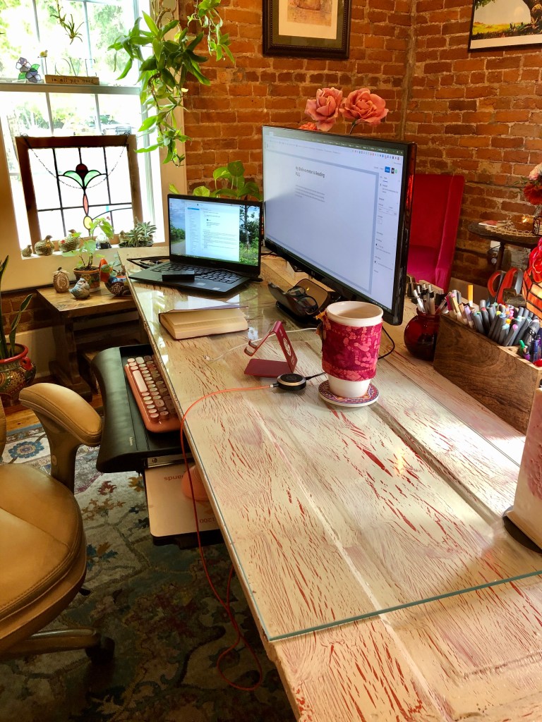 I’m still working on decorating the office, just figuring out what works and what doesn’t. While I’m waiting for my plant stand to arrive, I’m enjoying my plant corner a lot using the old table that’s been hanging around for years.