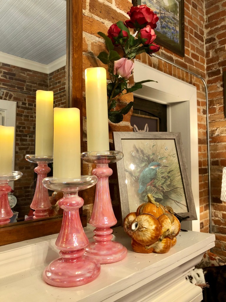 I had a bunch of candles that were just sitting on the shelves, so I got some inexpensive candle holders for them, such as the shiny silver ones above and these extra pink ones for the mantel. They aren’t fancy heirlooms, but they are cheery, and will look good lit up (too bad I still haven’t managed to sneak into an uncrowded store and buy more AA batteries).