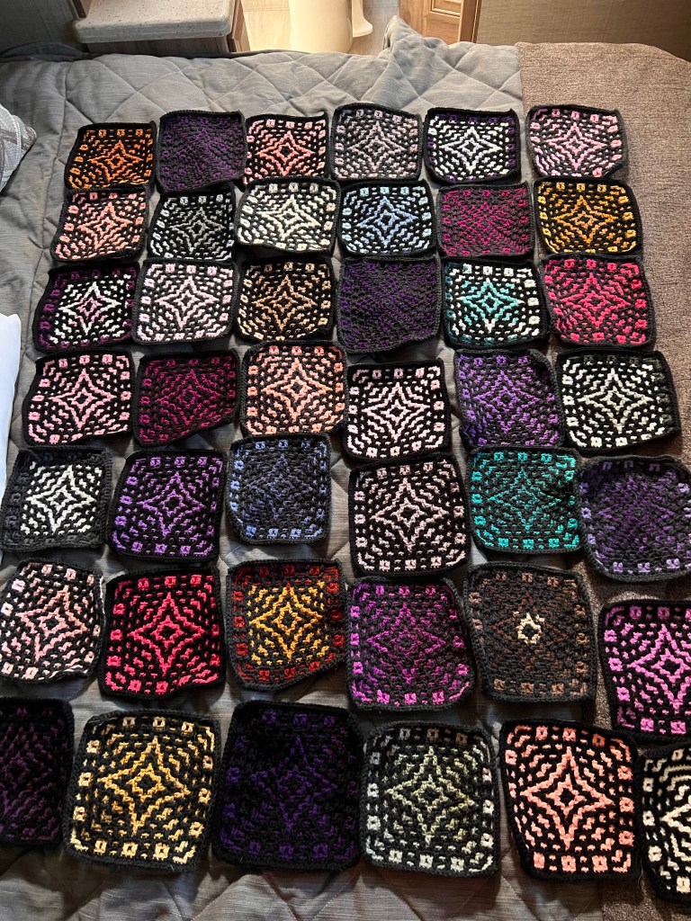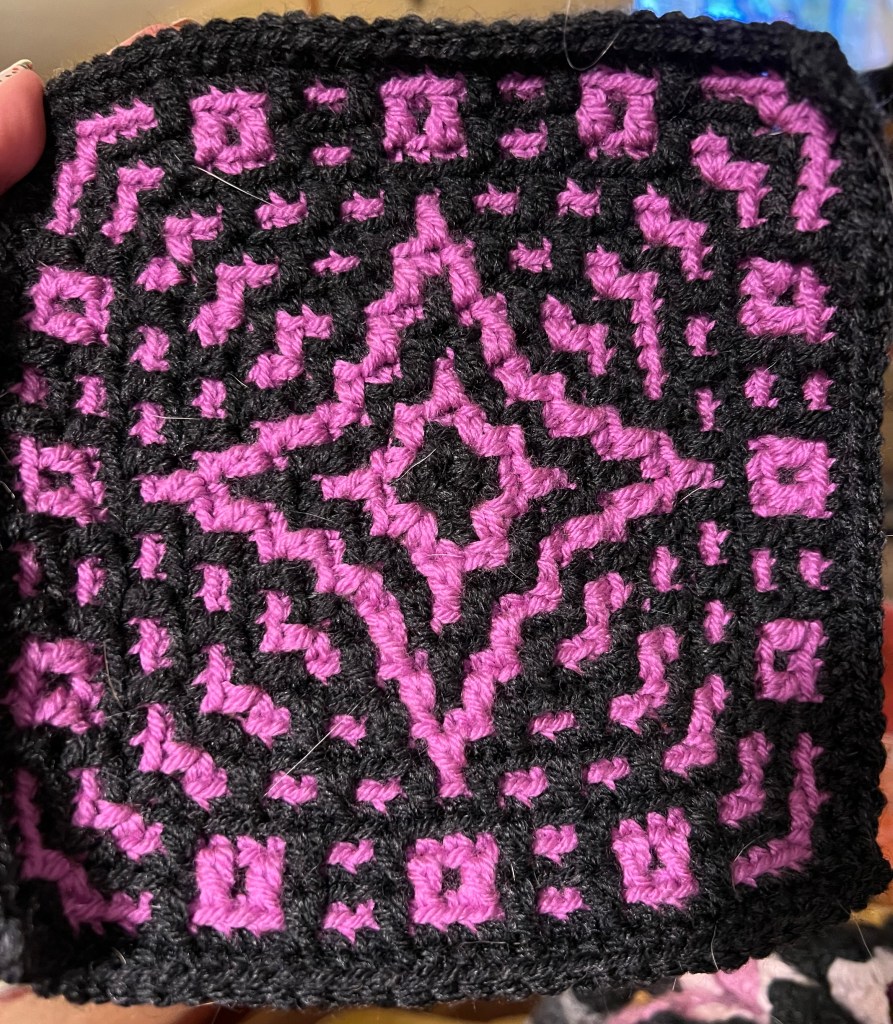 The squares are very thick because it’s mosaic crochet. I enjoyed making the squares! I may do a mosaic border, too.