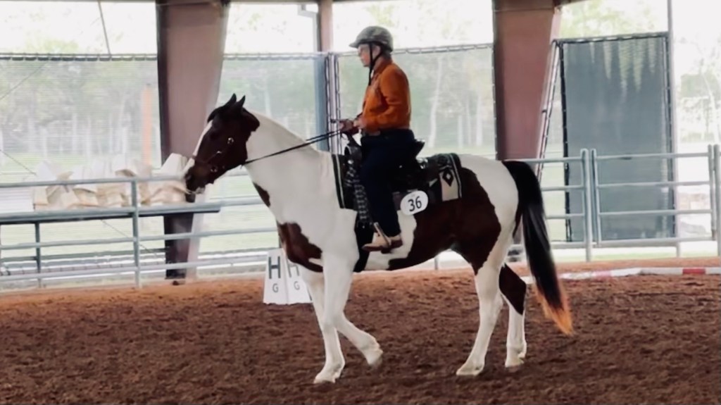 Apache was jittery in Functionality, the first part of the show. I didn’t think I was, since I knew the dressage pattern and knew he could do all the parts. I was ready to try to improve our performance by showing what we’d learned, but I insisted got to show how to deal with a horse that decides not to leg yield or turn right at a trot, both things he knows how to do. We were at Tarrin’s, too, the place he practices.
