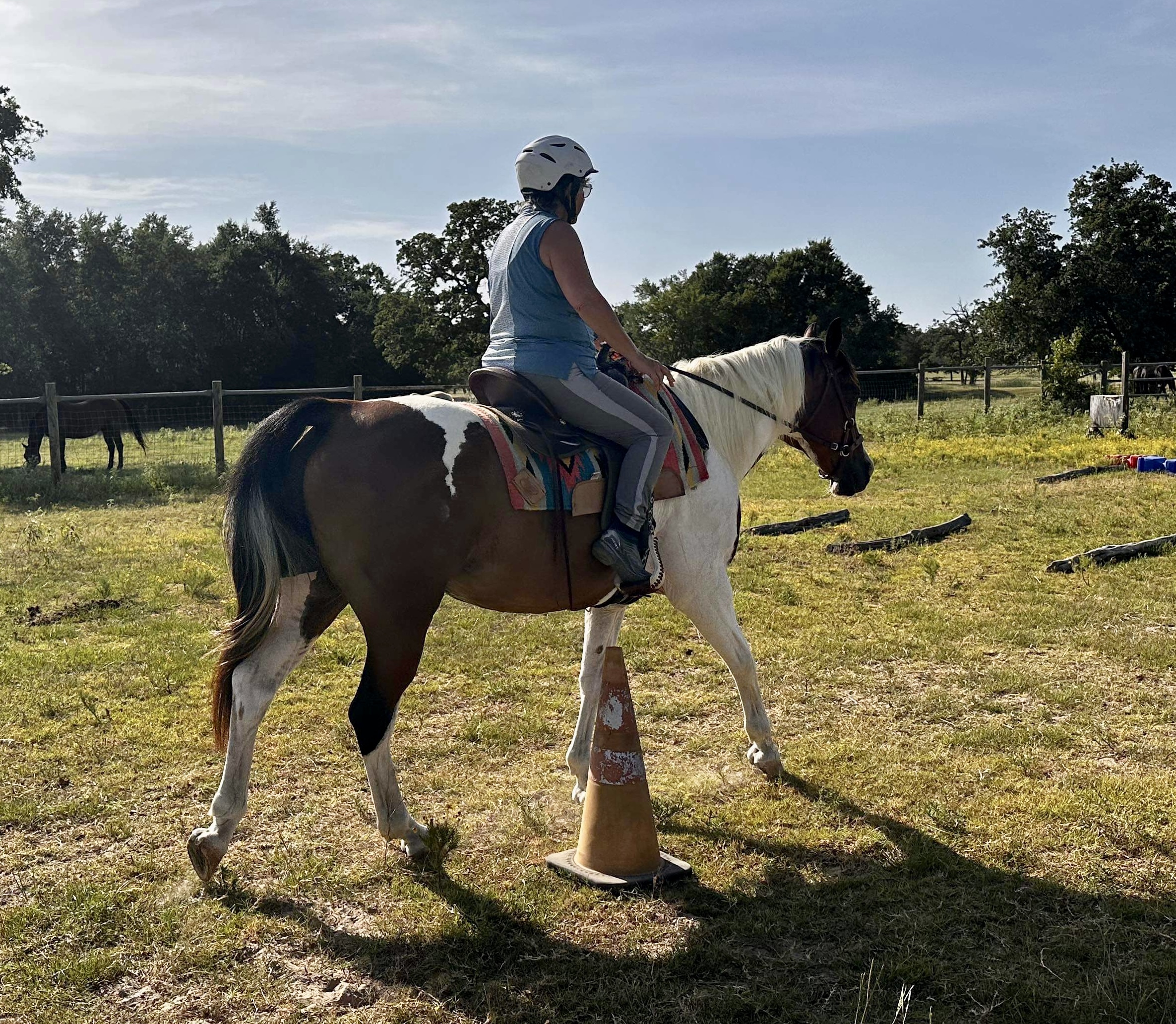 This morning, we cantered like a normal horse and human. I wish I had photos, but we were busy. Apache sweated a lot.